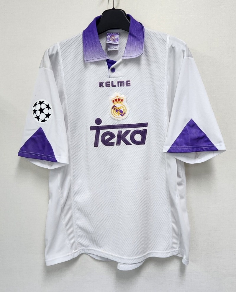 La camiseta para la temporada 97-98 del Real Madrid está empatada con esta del Barça; y es algo un poco más especial. ¿Por qué? Pues porque es de la época de cuando Kelme era quien le hacía las equipaciones al equipo; por lo que el lenguaje de diseño es algo completamente diferente a lo que estamos acostumbrados a ver. Esta en concreto presenta un cuerpo de malla técnica y corte oversize blanco, acentuado or un cuello de polo con degradado morado, a juego con detalles en las mangas.
