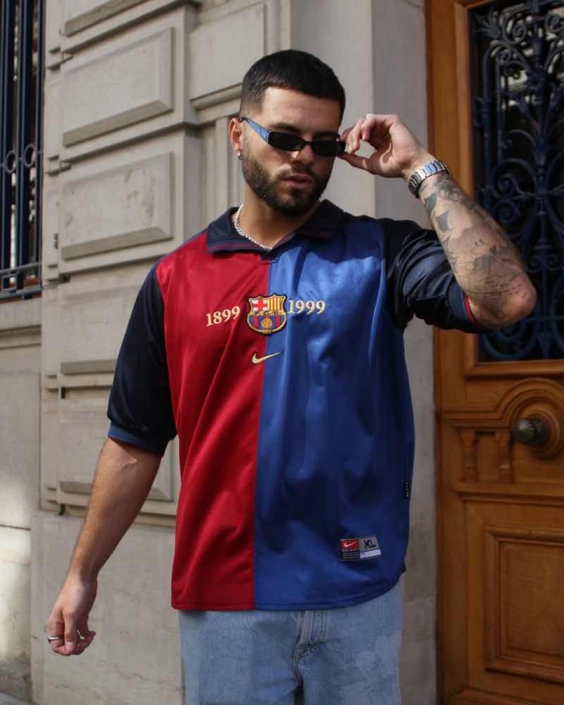 Mucho de los mejores looks de bloke core que vemos en redes tienen algo en común: se arman con camisetas retro de fútbol a rayas. Este tipo de estampado le da una dimensión más interesante a nuestro look y la del Barça 1998-1999 es una de las mejores. Esta equipación presentaba un diseño de rayas mucho más gruesas y bordados puestos en todo el centro (lo que nos calma el Toc de la asimetría).