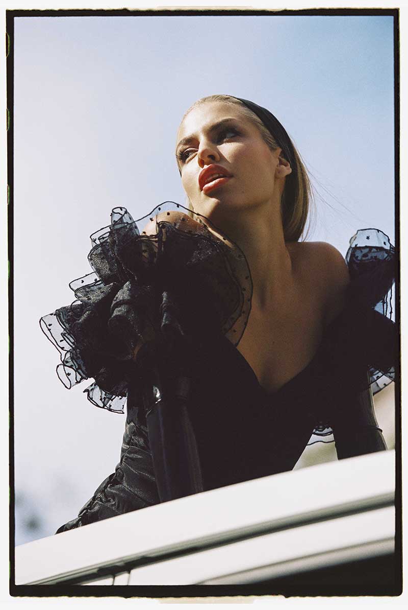 Esta propuesta nos ofrece el equilibrio perfecto entre seductoras prendas románticas y piezas con toques más atrevidos. Dentro del primer grupo, encontramos tops y vestidos que llevan la atención a la cintura y a los hombros, gracias a telas de satén y a prendas con volantes de organza XXL. Una de las propuestas más rompedoras es un traje de vinilo en color crema, compuesto por una americana cropped y unos pantalones con sugerentes aberturas en la cintura.