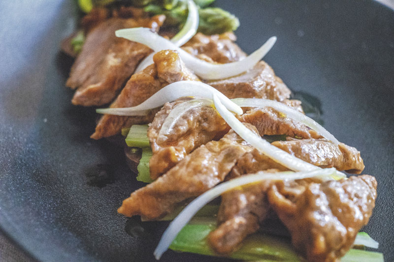 Imagen superior: Ensalada templada de espárragos verdes y pluma ibérica escabechada (Jornadas de producto en Carbón Negro)
