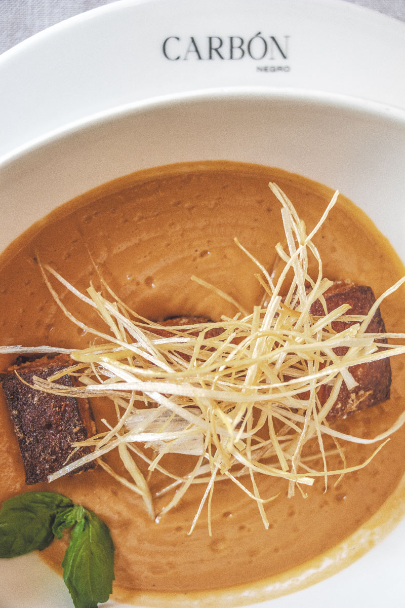 Imagen superior: Salmorejo de tomate asado a la brasa con torreznos ibéricos fritos (Jornadas de producto en Carbón Negro)