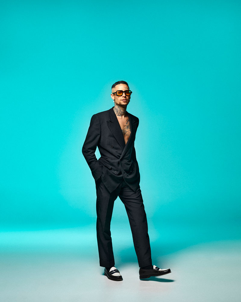 JoshOrtiz con traje de Saint Laurent, zapatos de Weejuns y gafas de Gucci