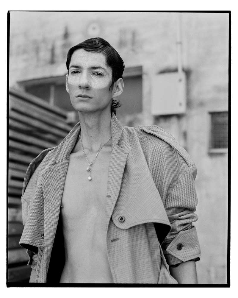 Collar Marina Figueiredo + Gabardina Andrés Zurru + Pantalón de satén CDLP + Sandalias Central Saint Martins x Birkenstock