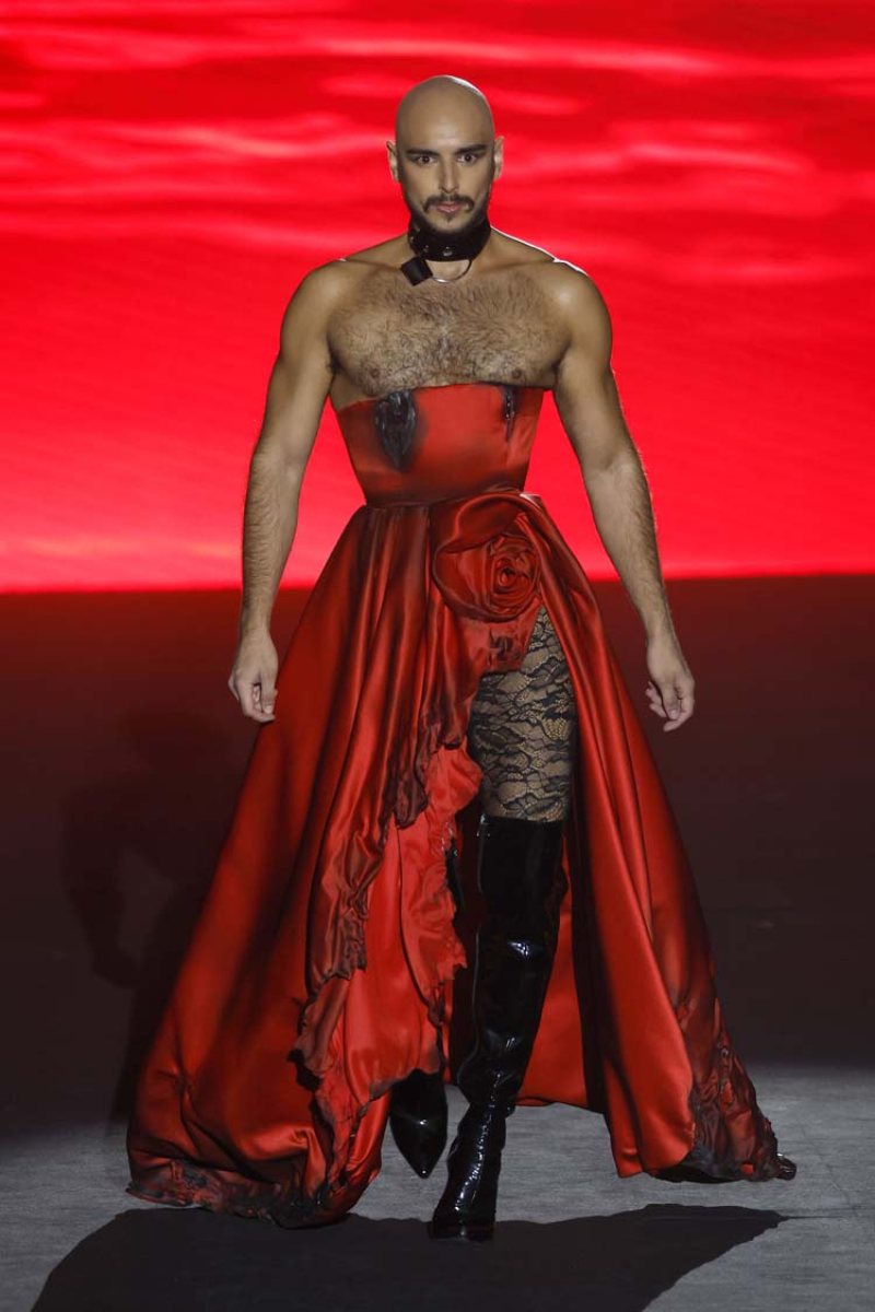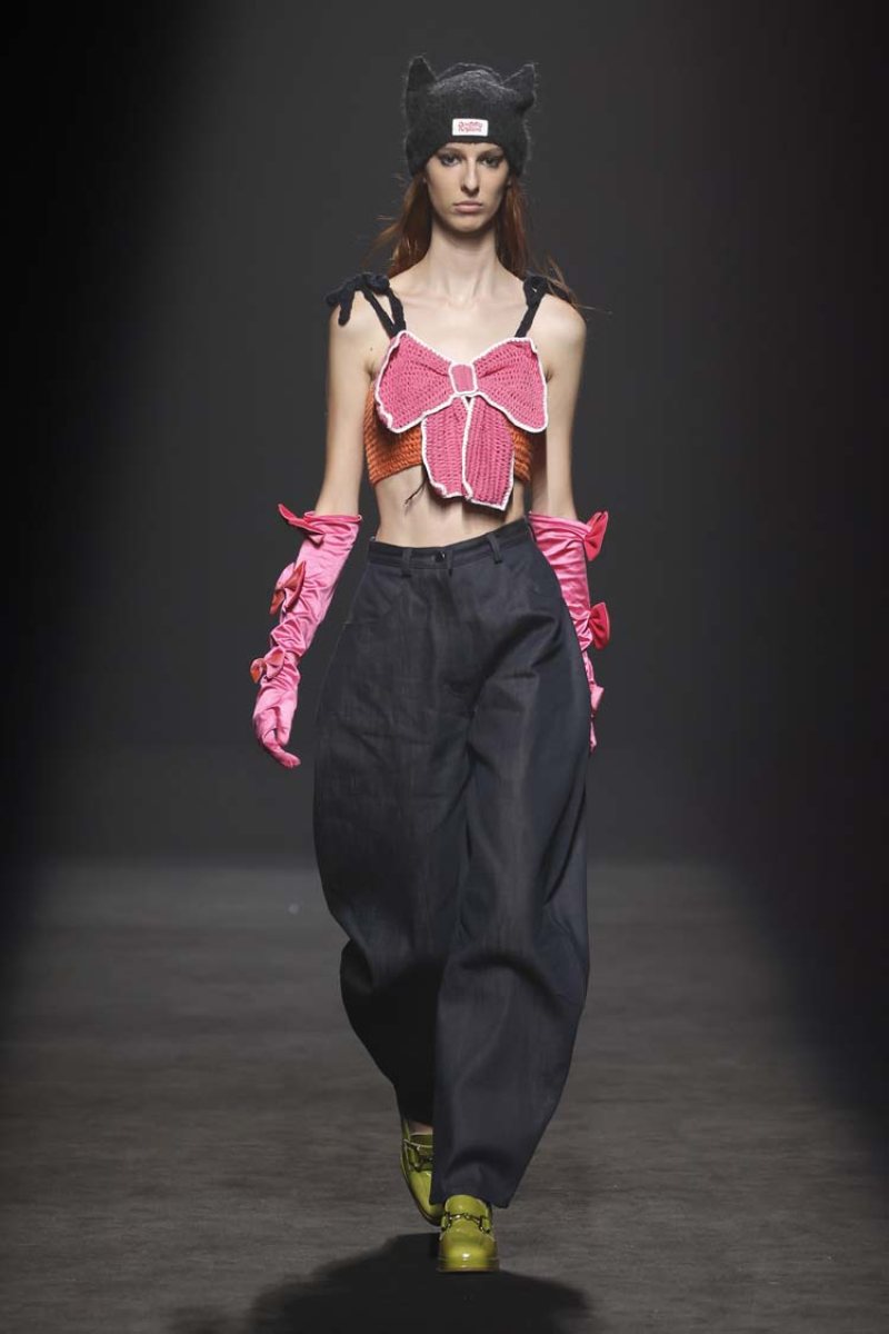 Y la última en cerrar esta edición fue Dominika Kozáková. Como en otras ocasiones, esta fue la marca internacional invitada. Ella es habitual en la Semana de la Moda de Praga. La diseñadora utilizó las referencias barrocas y florales, para presentarse al público de España. Todos los diseños son para destacar y analizar, pero el elemento más llamativo es el gorro de lana. Son gorros esponjosos que están tejidos a mano. Seguramente, te venga a la mente esos gorros que alguna vez llevó Rosalía. Debes saber que esos gorros pertenecen a esta diseñadora. Tanto por este accesorio como por las flores de terciopelo hechas a mano, esta diseñadora te devuelve a la moda más vanguardista de Europa.
