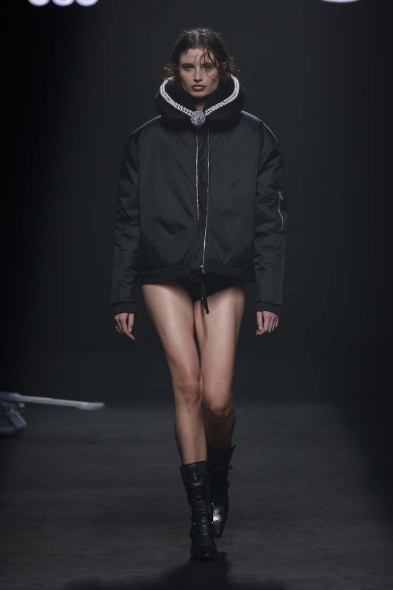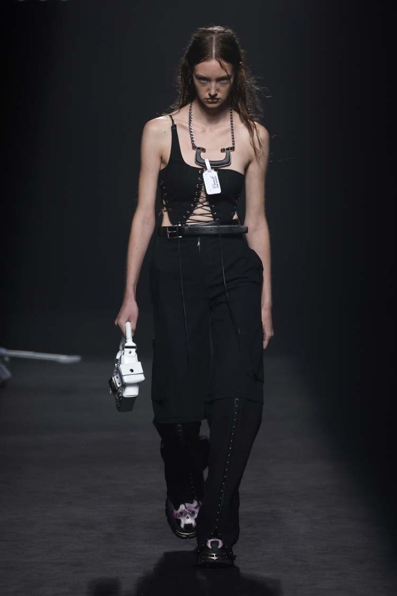 Toca ir a un aeropuerto y afrontar la rapidez que tiene un control de seguridad. Crack lo sabe bien, debido a que él es de Las Palmas de Gran Canaria. En su colección reflejó el cambio de zona de confort, y cómo nos influye a la hora de vestir. Hemos podido ver prendas con tonalidades oscuras, pegadas al cuerpo con estética pop del 2000. Siguiendo el hilo de su firma, no se olvidó de la silueta de la mujer y de la importancia de los accesorios. Por ese motivo, contó con la joyería de Jane Bardot. Para esta ocasión, la joya de la colección fue un gigante collar de perlas con broche en medio. ¿El detalle más original? Un collar con la bolsa donde metemos los productos que contienen líquido para pasar al avión.