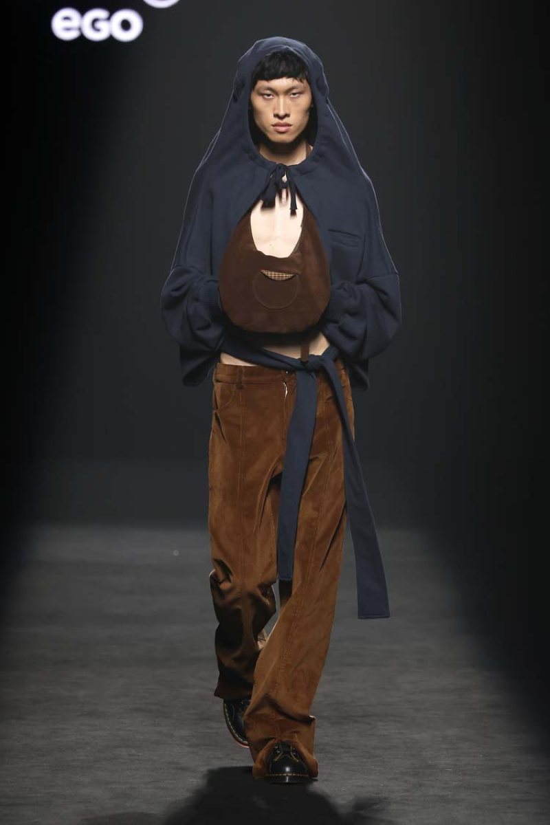 La jornada de la 22ª edición de Mercedes-Benz Fashion Talent acabó con dos desfiles que darán mucho de qué hablar. Primero fue Javier Guijarro con sus diseños que investigan los códigos de identidad. El joven que conquistó a Bad Gyal con su colección de final de grado, esta vez lo intentó con el jurado. Debut(i), primera línea de Javier Guijarro que se está construyendo a medida que el diseñador investiga y evoluciona. No hay ninguna duda que el diseñador quiere dejar atrás los códigos antiguos de la masculinidad. Y en consecuencia, elevar actitudes que son más cercanas a su generación. Toda esta idea la realizó con tejidos que son habituales en el armario de hombre, pero dándoles una vuelta.