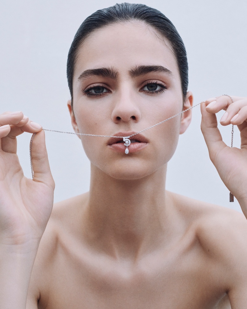 Recordando el color dorado de la fragancia Nº5, esta nueva joyería de lujo de Chanel es una de las mejores interpretaciones. De hecho, si te fijas bien, el número de la suerte de Gabrielle está adornado con diamantes que capturan la luz como un rayo. Un detalle que no es casual, ya que en la curva del número se encuentra otro diamante con engaste cerrado, un sello de la casa francesa desde 1932. Esta particularidad es una metáfora visual de cómo una gota del perfume cae sobre la piel. Por último, el contraste entre el brillo de los diamantes y la pureza del oro es el detalle que define cada joya.