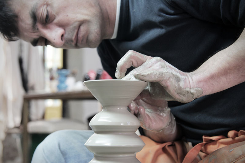 Mi encuentro con la cerámica es a los 6 años después de consumir toda la plastilina de mi pueblo, en contra de lo que se cree, no tengo antecedentes familiares con relación a la cerámica. Mi abuelo era ebanista y mi bisabuelo era artesano del vidrio. Es una ventaja no haber heredado la tradición cerámica, me da la oportunidad de ver con otros ojos las nuevas propuestas cerámicas en las que trabajamos.