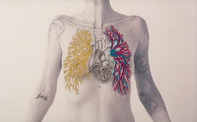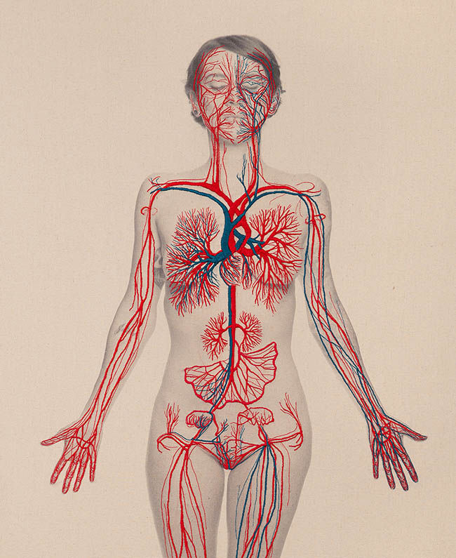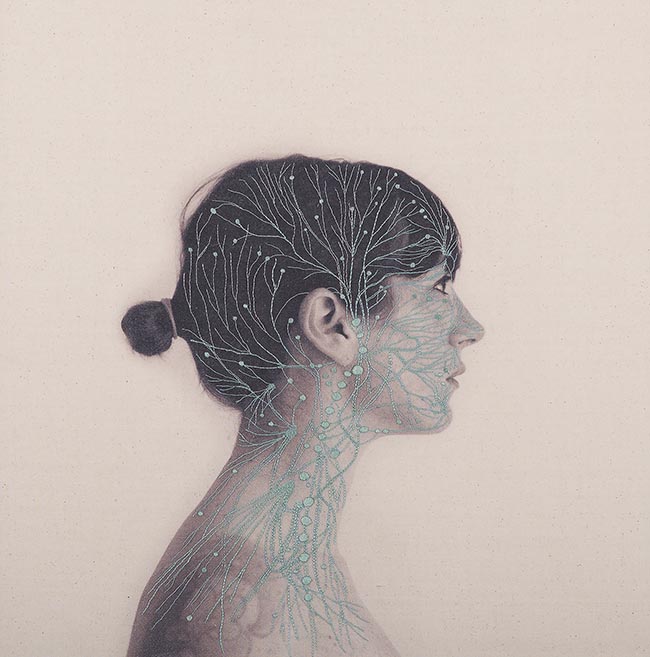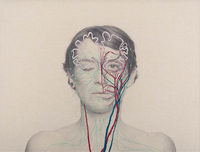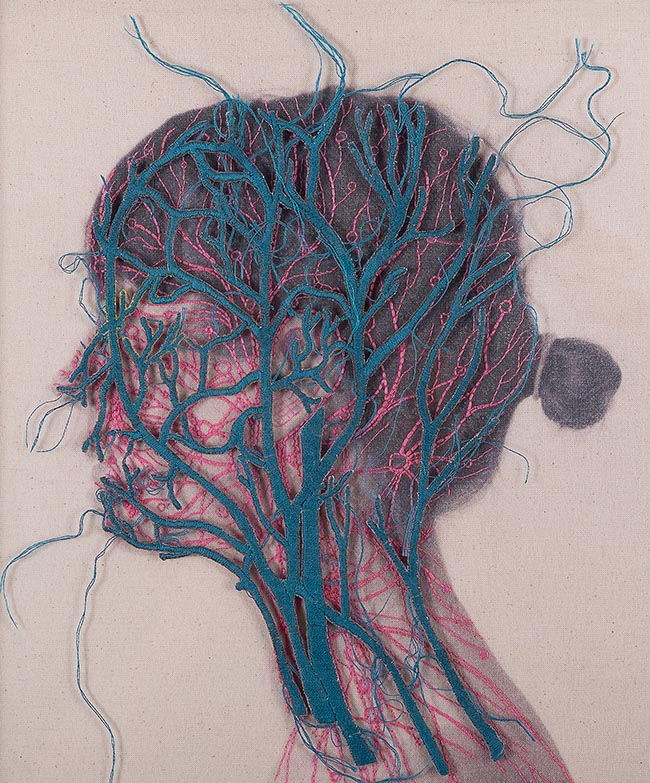 Llamé a esta serie Constructal por las ideas de Adrian Bejan, un físico de la Universidad de Duke que explica cómo los sistemas vivos (de flujo) optimizan los recursos y generan la forma característica del árbol en diversos niveles del mundo orgánico e inorgánico. Esta forma rige desde el tránsito de las ciudades y la arborescencia de nuestros pulmones hasta los clusters de galaxias y el flujo de electrones en el cerebro. Externalizamos de manera constante este patrón, sin darnos cuenta, ya que estamos totalmente inmersos y sostenidos en él. Empecé a bordar esa forma ubicua sobre autorretratos impresos en telas. A medida que cubría mi imagen con los órganos y sistemas que componen mi cuerpo, lo vi desaparecer y convertirse en otra cosa, al punto que amigos cercanos no reconocían que yo era la modelo, lo que me enseñó que el concepto fijo que tenemos de nosotros mismos es más frágil de lo que imaginamos.
