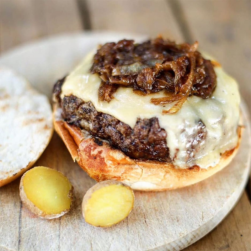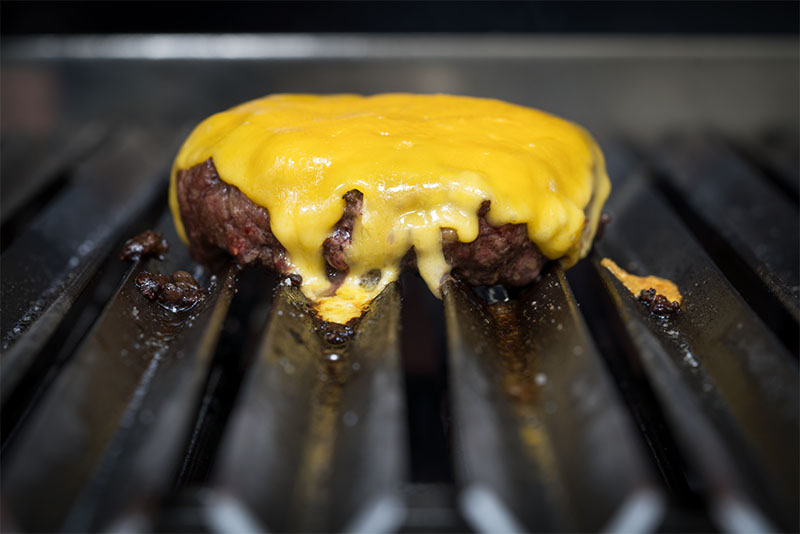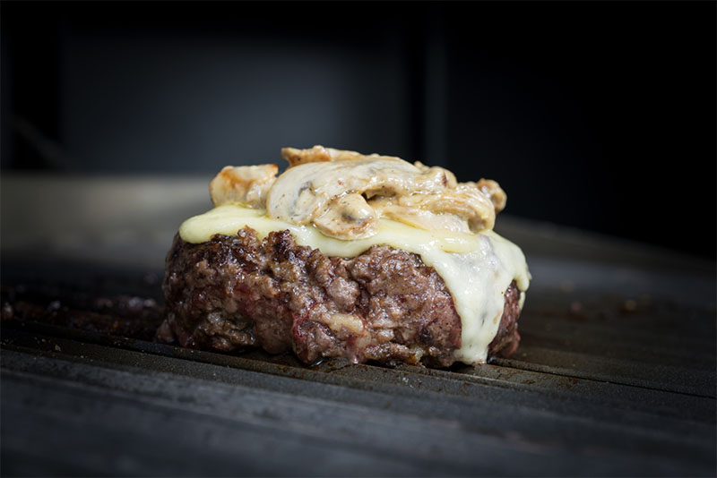 Imágenes superiores: Bacon Juancheeseburger en parrilla y en mesa