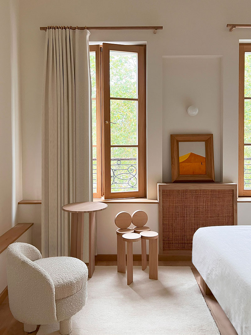 Sí, fabricamos casi todos los objetos: muebles, lámparas, manillas, ventanas, puertas… En el hotel, el 80 % de los elementos están hechos de eucalipto. Evidentemente, utilizamos algo de roble que teníamos en stock.