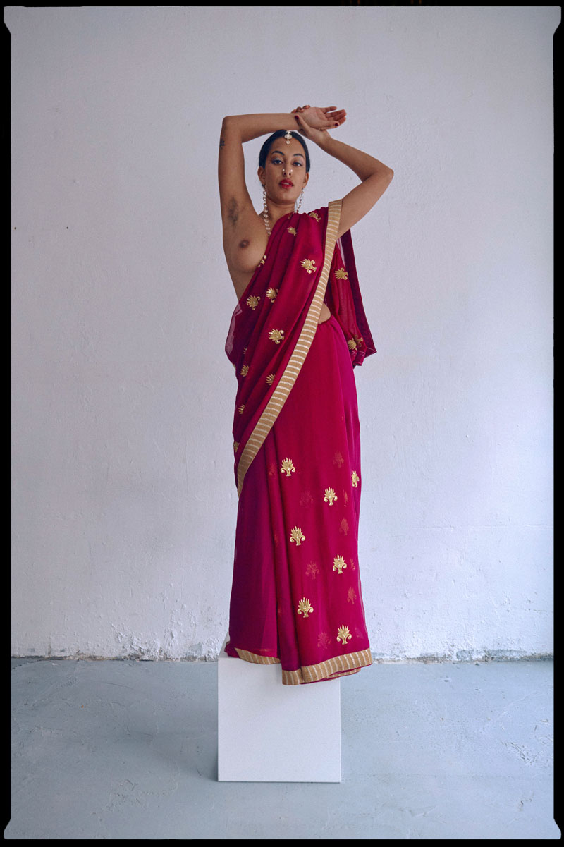 Hemos conformado esta historia junto a Marina Gomes y su nueva firma NANKE, donde hemos querido representar la sexualidad, la tradición y la resiliencia dándole un nuevo significado a través de las imágenes. Kali Sudhra se muestra como una nueva Venus, mitad divinidad mitad humana, performando a través de su cuerpo y su ropa una no normatividad dentro del arte occidental blanco y sus múltiples reglas asfixiantes.
