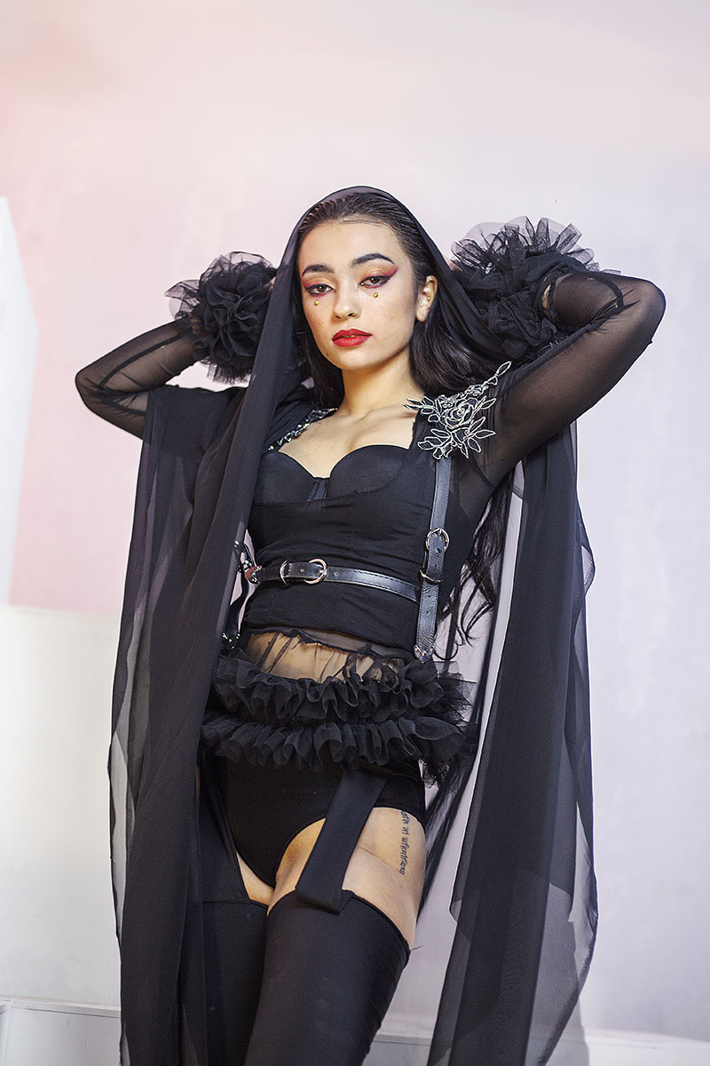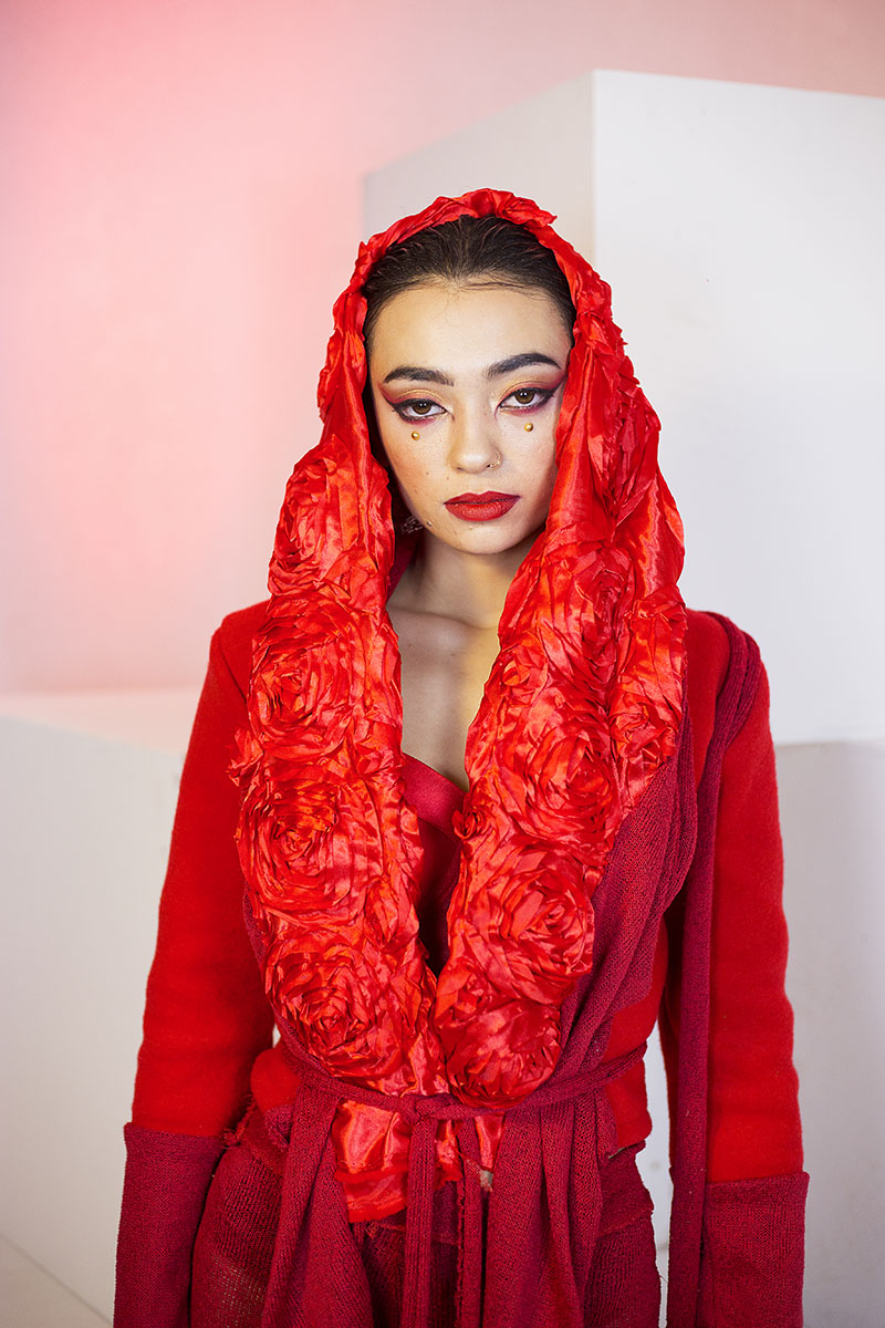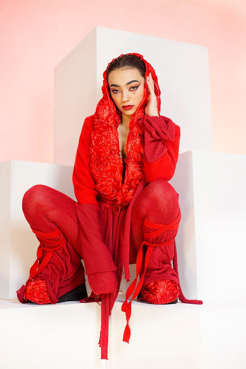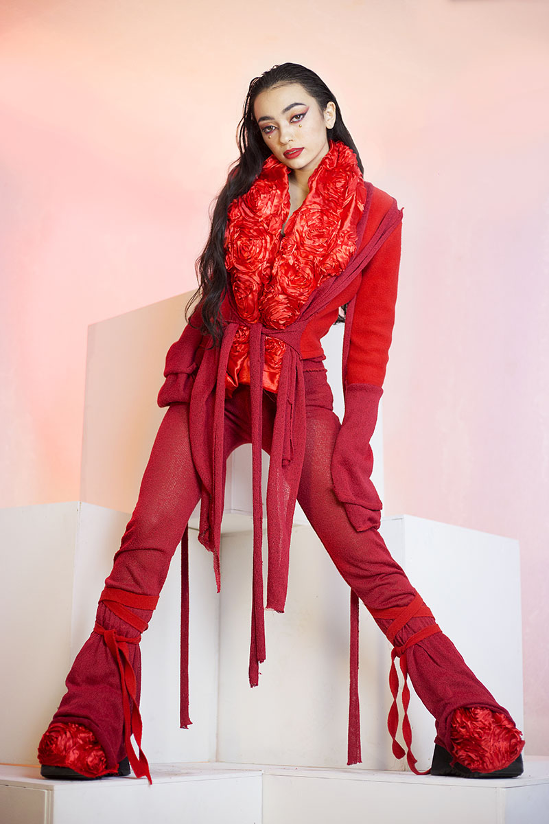 ¿Qué me puedes contar sobre esta colección? Para esta colección me llevé a mis musas, las divas flamencas de compras por Harajuku, el barrio japonés rey del streetwear. Todas las prendas están echas por mí, usando un 70% de telas sostenibles. Por ejemplo el latex rojo venía con un minúsculo defecto de fábrica, tenían cientos de metros para tirar, y el vestido negro es de Lycra hecha con botellas de plástico recicladas.