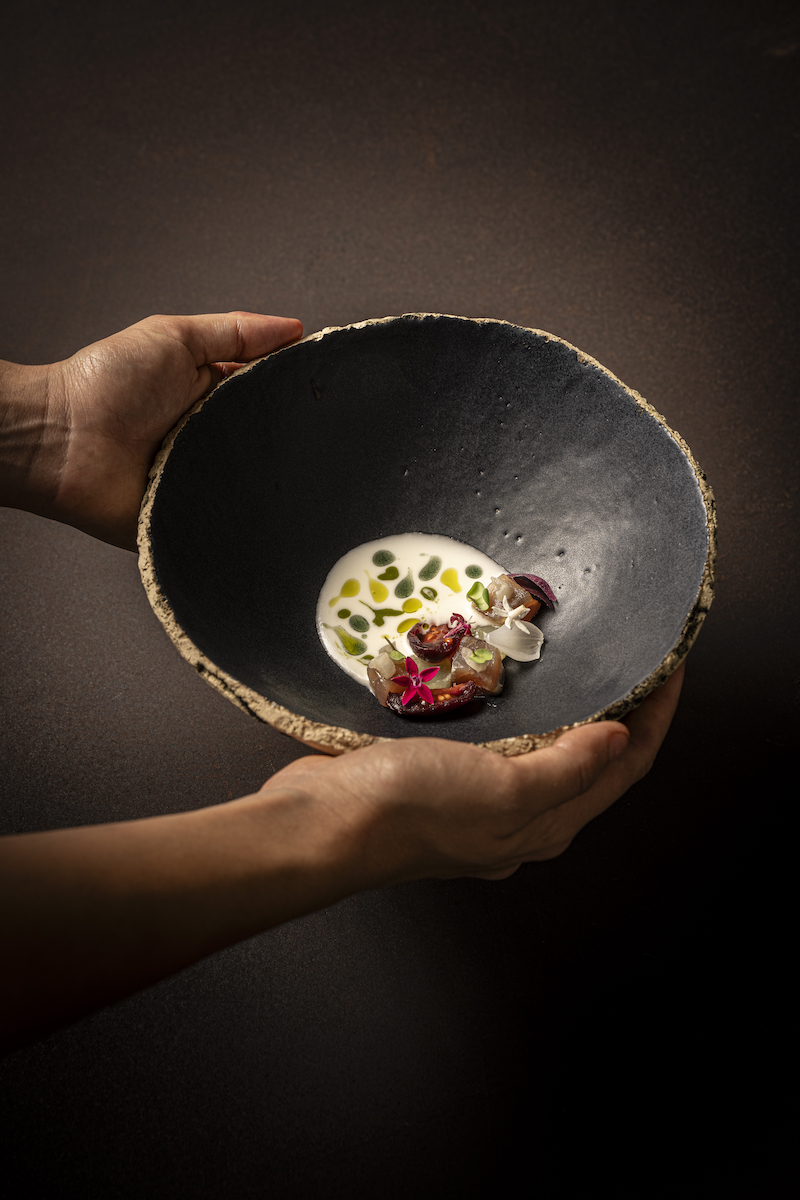 El mar se abre paso con la Gamba de La Santa, servida con granizado de cilantro y mayonesa del mar. Le sigue el Salmón de Uga, sobre pan de algas a la brasa con mantequilla de ajo y limón. La Ensalada de jurel mezcla suero de cebolla tierna, tomate osmotizado en cereza y lechuga en texturas.