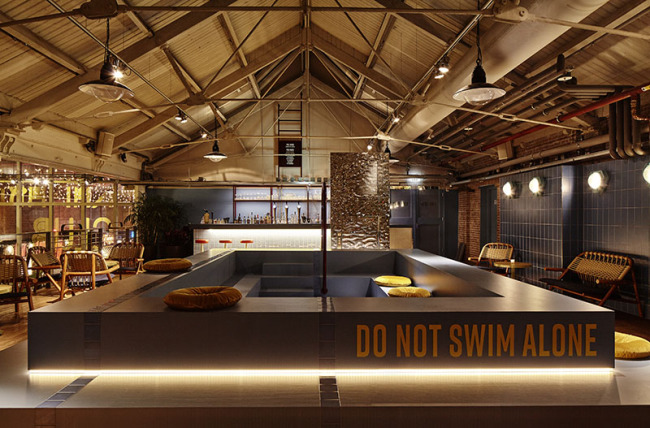 La vieja escalera está revestida en madera y a través de ella se accede a una zona superior en la que se encuentra la zona Pool Bar, un espacio lounge que simula a una piscina, la idea viene de los okupas que vivieron en ese espacio los años que estuvo cerrado. Los okupas aprovechaban en verano el agua que se colaba cuando llovía por el techo quebrado sobre esa superficie y lo utilizaban como piscina. Studio Modijefsky ha querido mantener la esencia con este espacio de piscina simulada para Kanarie Club a partir de colores, materiales y elementos como por ejemplo los cojines que aparentan ser flotadores.