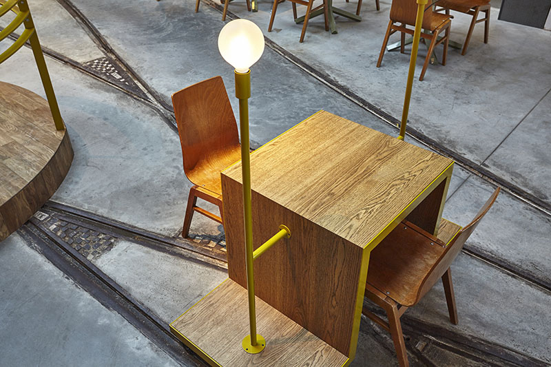 Todo el mobiliario ha sido diseñado por Studio Modijefsky y están inspirados en el interior de los antiguos vagones de los tranvías.