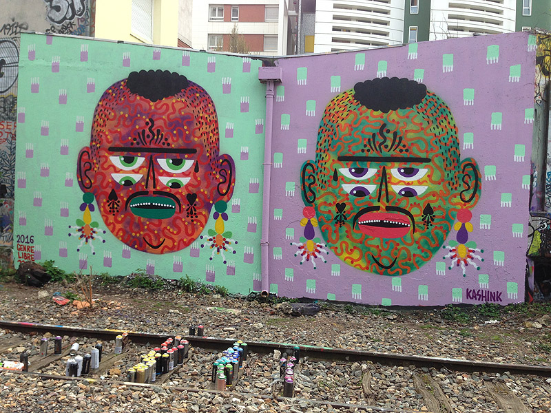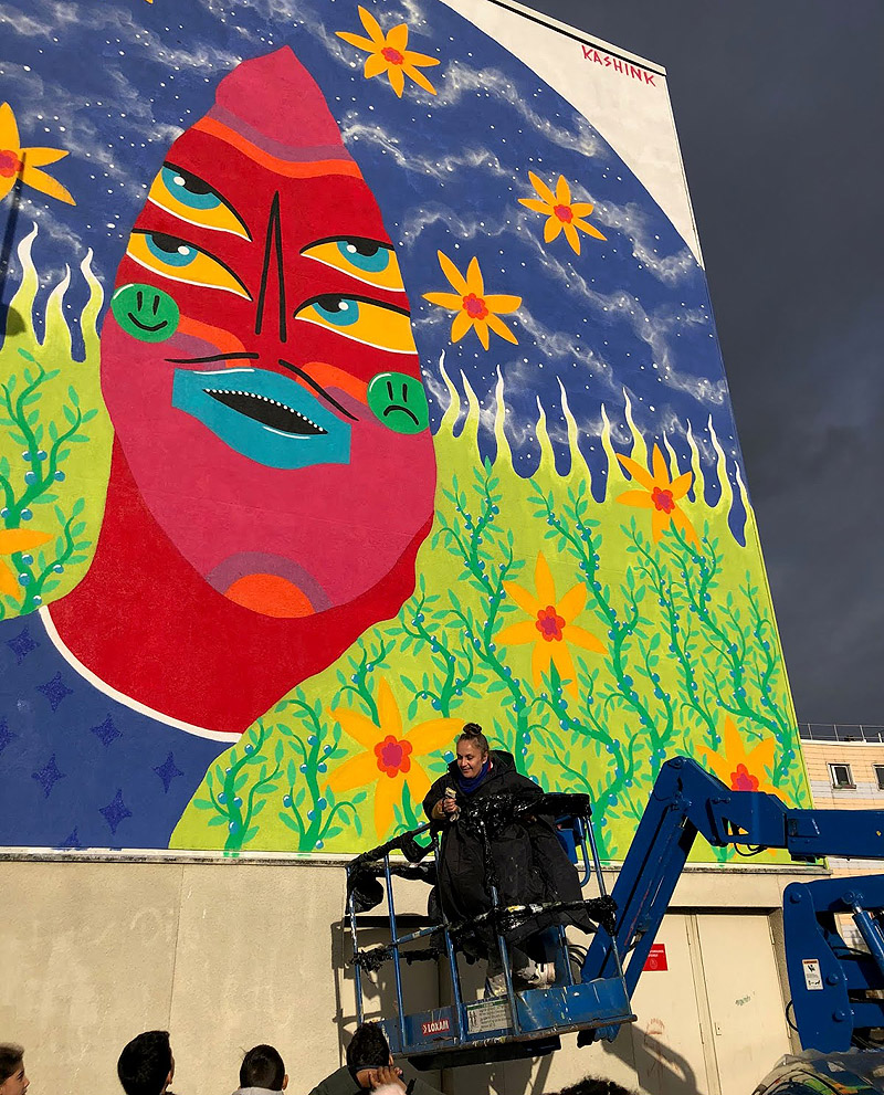 Podríamos afirmar que Kashink es una de las pocas artistas urbanas que reivindican de forma activa la identidad y la diversidad. Su obra cuestiona la tradición y las apariencias planteando personajes de aspecto hibrido. Con un sello inconfundible, sus murales representan personas de cuatro ojos, generalmente gordos y peludos, trazados con líneas gruesas y colores vibrantes.