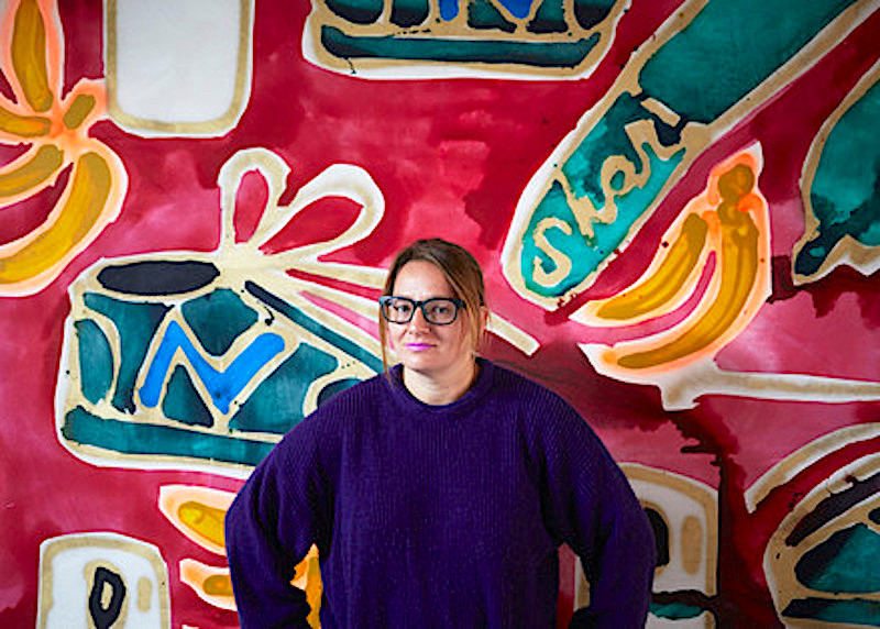 Inspirada siempre en la cultura pop, primero exploró los patrones en el contexto de las alfombras importadas, pero las obras más recientes de Katherine Bernhardt vienen del interés de la artista por el método de la impresión a la cera holandesa y los patrones de textiles africanos.