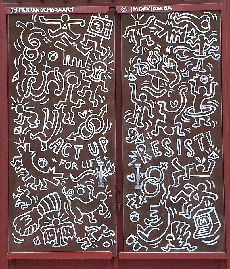 Se trata de dar más visibilidad a lo queer con un homenaje a Keith Haring usando sus propios dibujos y otros nuevos pero con su estilo (como la mano de Ronald McDonald incluida en el graffiti, por ejemplo) y dando presencia en la calle a un icono de la cultura popular rosa. Mucha gente lo primero que hace es hacerse un selfie (dicen: Oh! Un Keith Haring) y esa era también la intención. Convertir esas puertas en Instagram Spot.