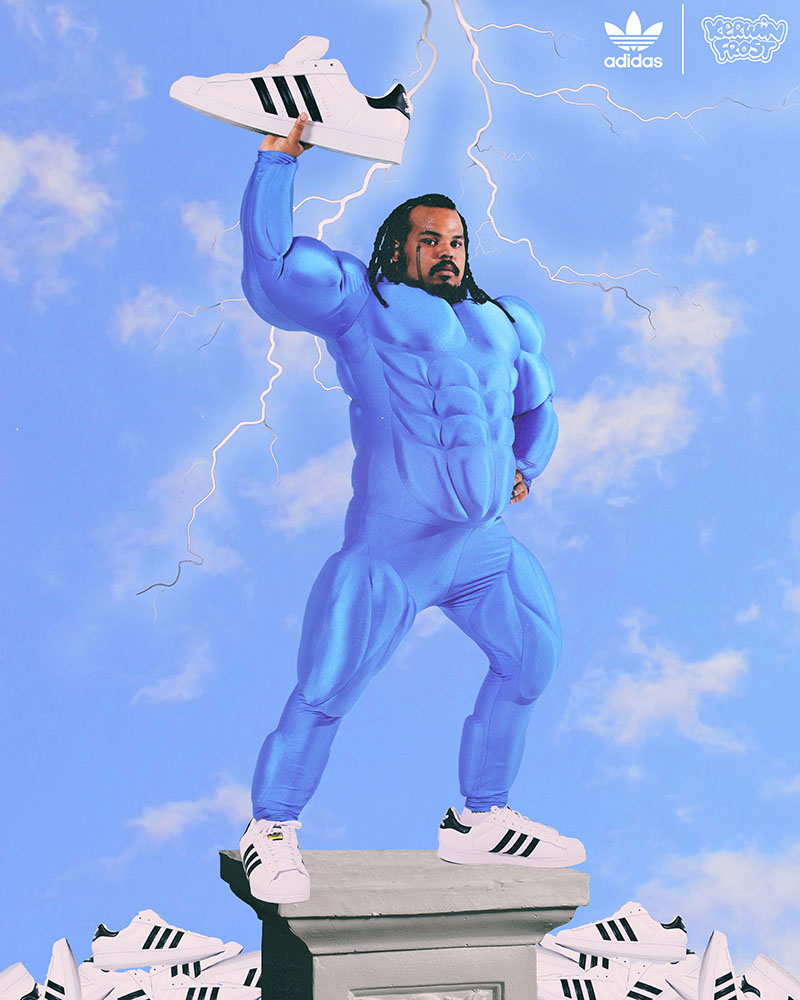 La primera zapatilla de Kerwin Frost y adidas, disponible a partir del 26 agosto, está inspirada en los típicos zapatones de payaso o el calzado que usan las mascotas deportivas. “Mi primera zapatilla con adidas es una obra maestra absoluta. Hemos cambiado por completo la genética de una zapatilla icónica, quizá la más importante de todos los tiempos. Y esto es arte”, dice Frost.