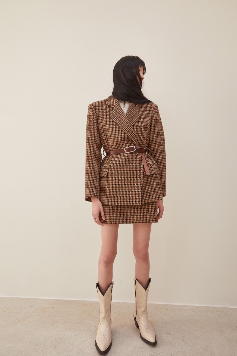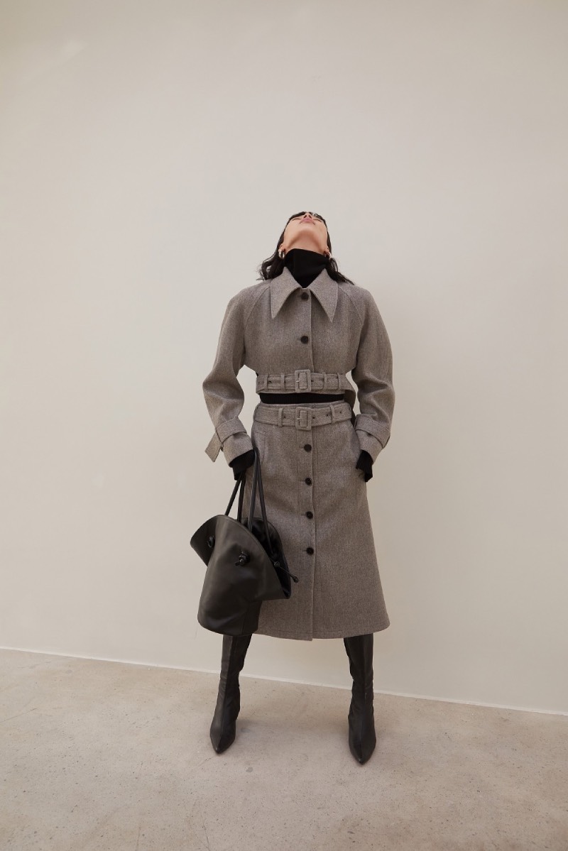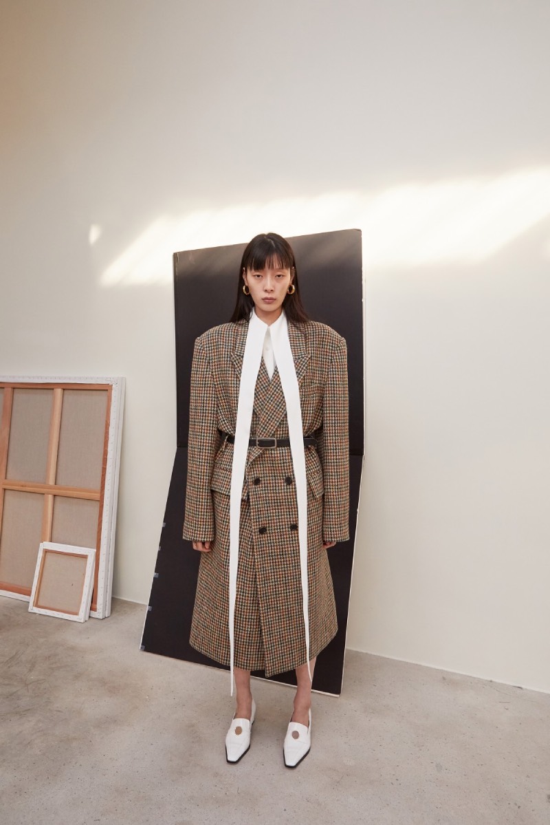 Lazos, drapeados, botones perlados de grandes dimensiones, y cuellos alargados que se ensanchan, conforman algunos de los detalles que dotan de interés estético y visual a las prendas. Items del Day to Day como abrigos a cuadros, conjuntos de traje, faldas, americanas y total looks de denim son algunas de las propuestas de Kimhekim FW21-22. A primera vista sofisticadas, femeninas y románticas, las vestimentas de Kimhekim terminan sorprendiendo al que presta atención y encuentra el toque disruptor y la esencia streetfashion que esconden en sus detalles.