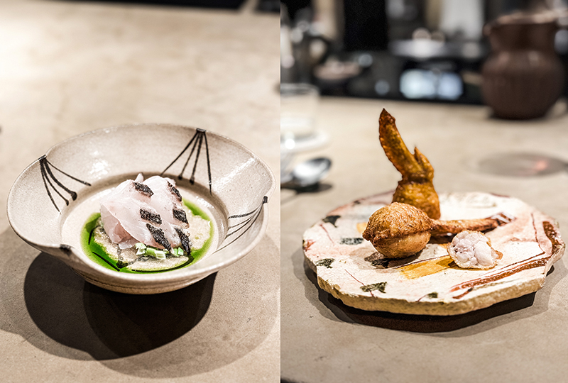 El menú baila al ritmo de las temporadas y de lo ofrezca el mercado diario. Dentro de su menú, destaca el sashimi de lubina con gelatina de ocra, aderezada con vinagre y aceite verde. El toque italiano viene de la mano de unos tallos de berros silvestres a la carbonara. Otra elaboración muy técnica es la alita de pollo frita, rellena de salchicha especiada. Una maravillosa chuleta de cerdo, cocinada a la parrilla, es acompañada de una mostaza antigua, una elaboración despojada de elementos superfluos, pero impecable. Para finalizar, en la secuencia dulce, un helado de kiwi autóctono es acompañado de una tarta de chocolate perfecta.