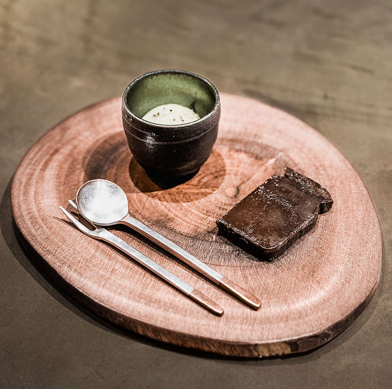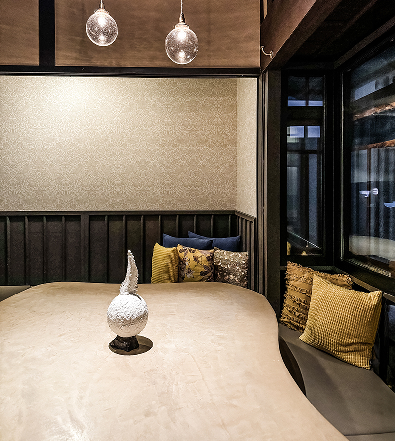 En el interiorismo, Coppie ha respetado la esencia de la casa, pero introduciendo maderas nobles y piedras naturales que le dan un toque sólido y elegante. Una iluminación muy cuidada hace un ambiente muy íntimo y acogedor. Con apenas mesas, la mayoría de los clientes comen en una barra de terracota, donde la interacción con el personal de sala y cocina es continua. Los roles de las parejas, al igual que en la mayoría de los restaurantes japoneses, son claros, ellos en la cocina y ellas en sala.