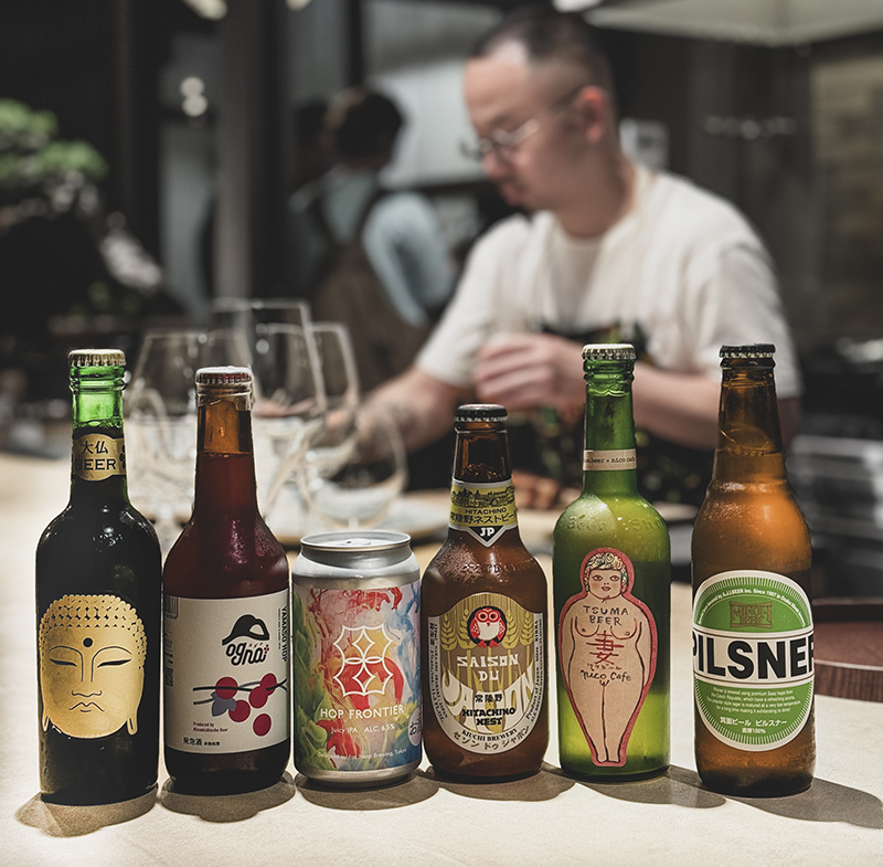 Imagen superior: Frontal del restaurante Sushizen, y cervezas artesanas de Kioto.