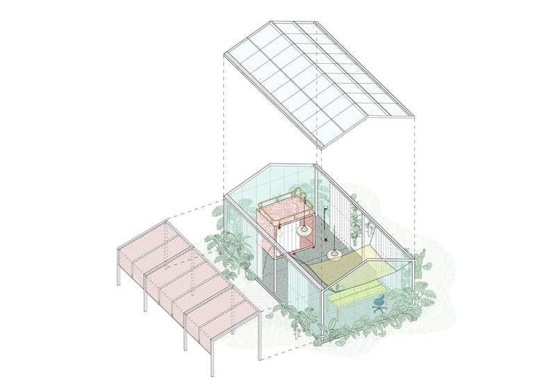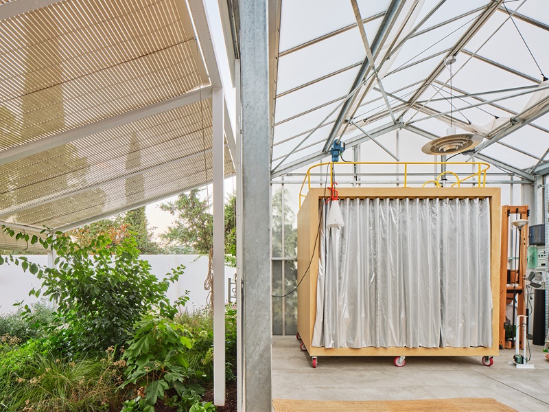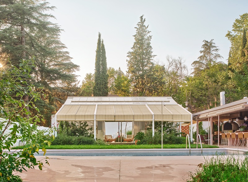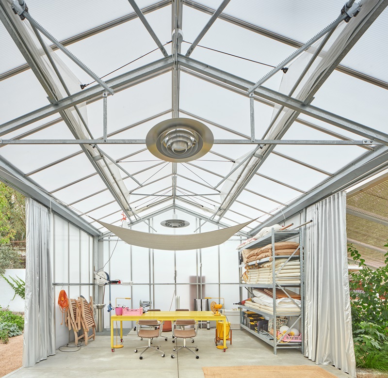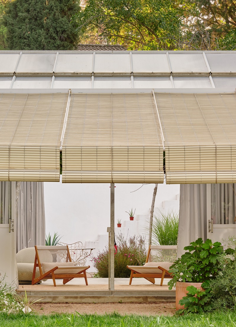 El exterior de la ligera estructura de acero galvanizado se caracteriza por su estética industrial. En el interior, la cubierta a dos aguas proporciona amplitud al espacio de 36 m2 (9 metros de largo x 4 metros de ancho), abundantemente iluminado a través del cerramiento de policarbonato translúcido. Para proteger el volumen del sol, los arquitectos colocan una pérgola con persianas de lamas de madera Barcelona. Y, además, añaden como barrera aislante unas cortinas térmicas en las puertas correderas de las dos entradas, que a su vez aportan privacidad al interior.