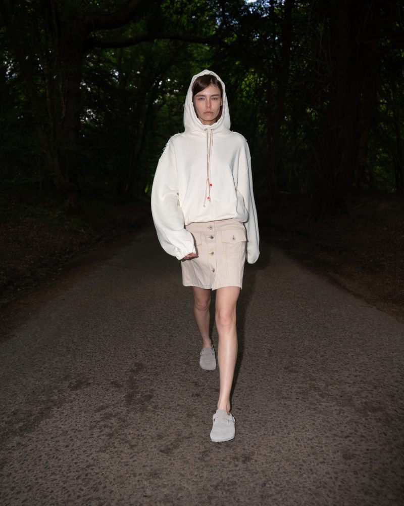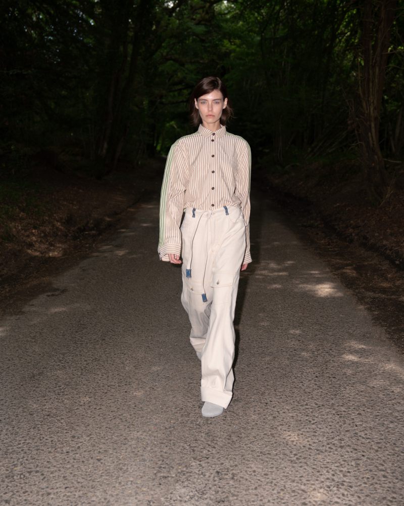 La nueva colección de la firma, al igual que entregas anteriores, también juega con la sátira y la ironía. Para este nuevo armario Ksenia Schnaider toma como base el armario primaveral femenino como sujeto (o víctima) de su deconstrucción. Aquí, vemos vestiditos y otros esenciales delicados contrastarse con tropes de la ropa de trabajo; los estampados se usan para aligerar el tono de las prendas más “rugged” … hay que pillarle el chiste.