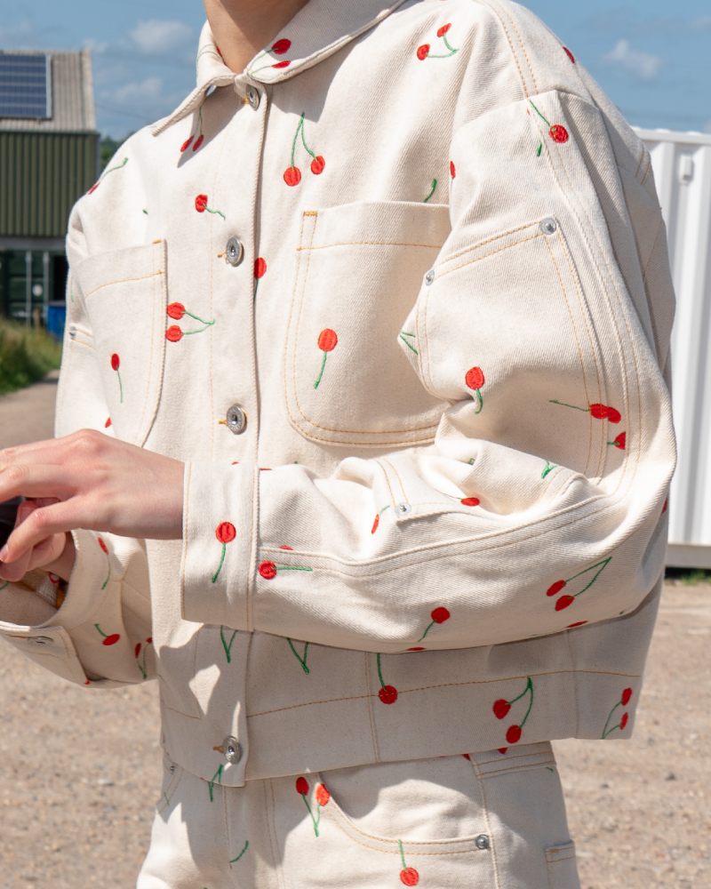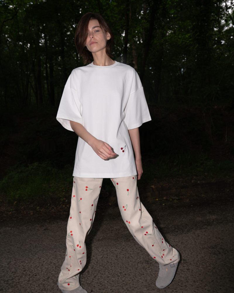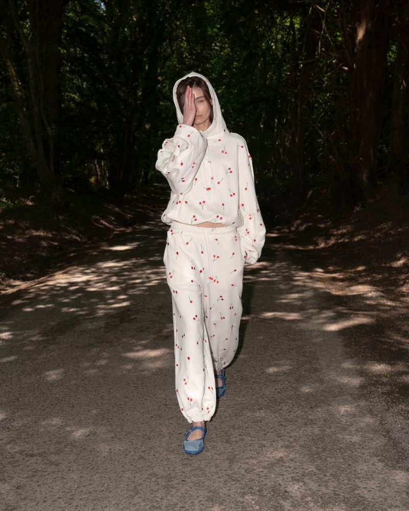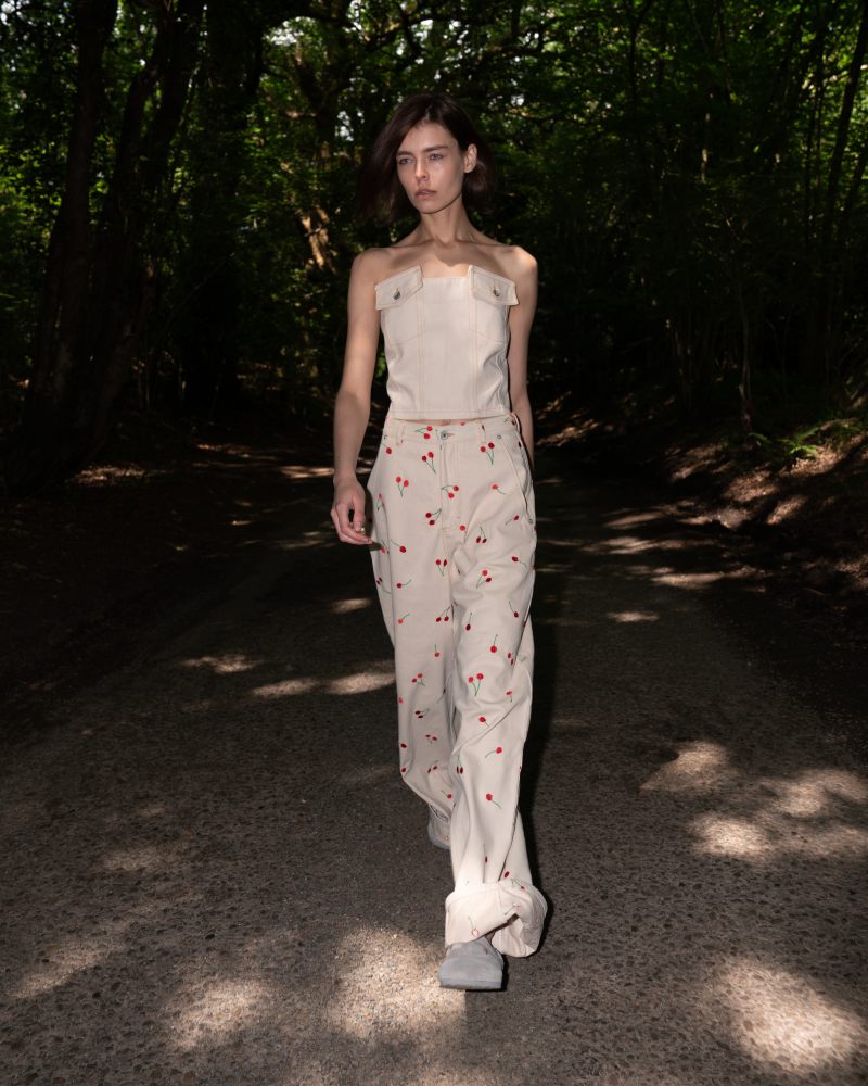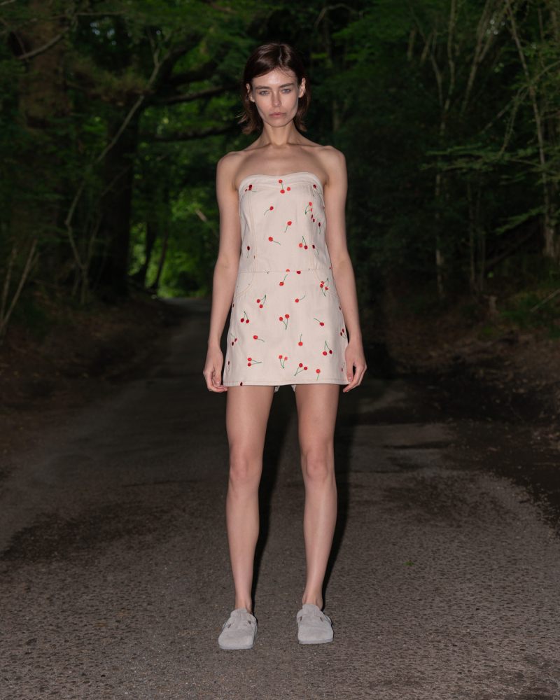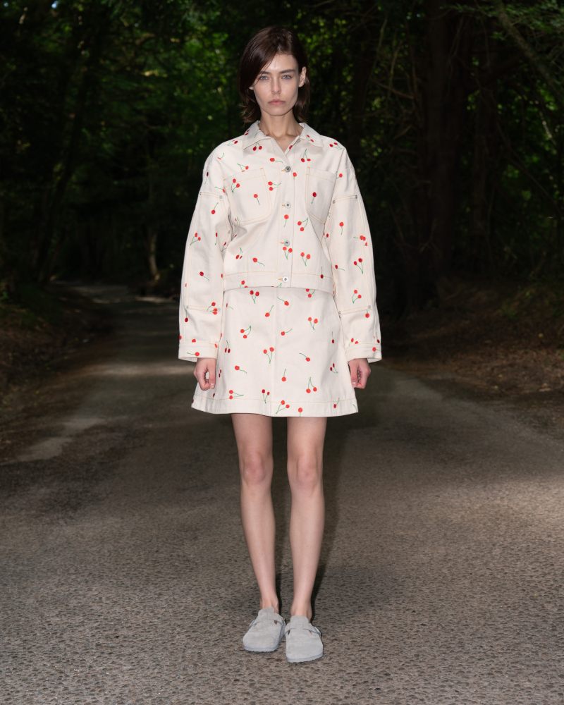 La colección Ksenia Schnaider Pre-Spring 26 abre con esenciales workwear y clásicos femeninos reimaginados con un aire más delicado. Eso se logra a través de un estampado de cerezas que han rescatado de su propio archivo; y sirve para mostrar una dimensión más delicada y “dainty” de lo utilitario. Aquí vemos cómo vestidos largos, camisas de botones e incluso faldas reciben este tratamiento. Pero también hay un poco del lenguaje reinventivo de la firma en, por ejemplo, un top que rescata la construcción trasera de un jean.