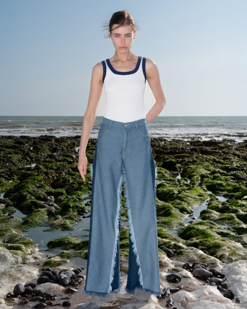 Pero ojo, ese es solo el primer componente de la colección Ksenia Schnaider Pre-Spring 26. La otra mitad viene como algo mucho más familiar para los que siguen el trabajo de la firma. Aquí, esa reinvención vaquera cobra protagonismo y crea piezas completamente nuevas basadas en algunas de sus técnicas más avanzadas. Y, como complemento, se ofrece también un set de esenciales más plain… para balancear la cuestión.