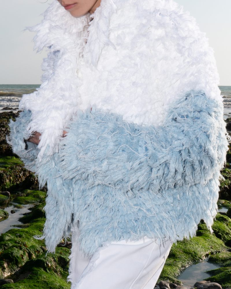 En el lado puramente denim y azul de Ksenia Schnaider Pre-Spring 26, también hay magia. La prenda estrella es un abrigo de pelo; pero no de pelo animal. Esta firma logró emular el look usando tela vaquera para elevar lo simple y relajar lo altamente statement. En esa misma línea, vemos pantalones abiertos de corte holgado, faldas vaqueras complejas y total looks que juegan con el patchwork de manera sublime.