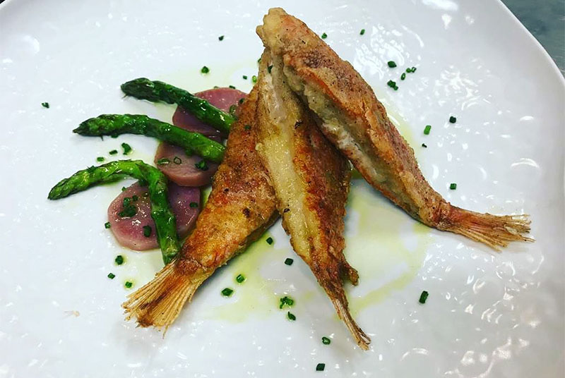 Imagen superior: salmonetes a la andaluza con trigueros salteados