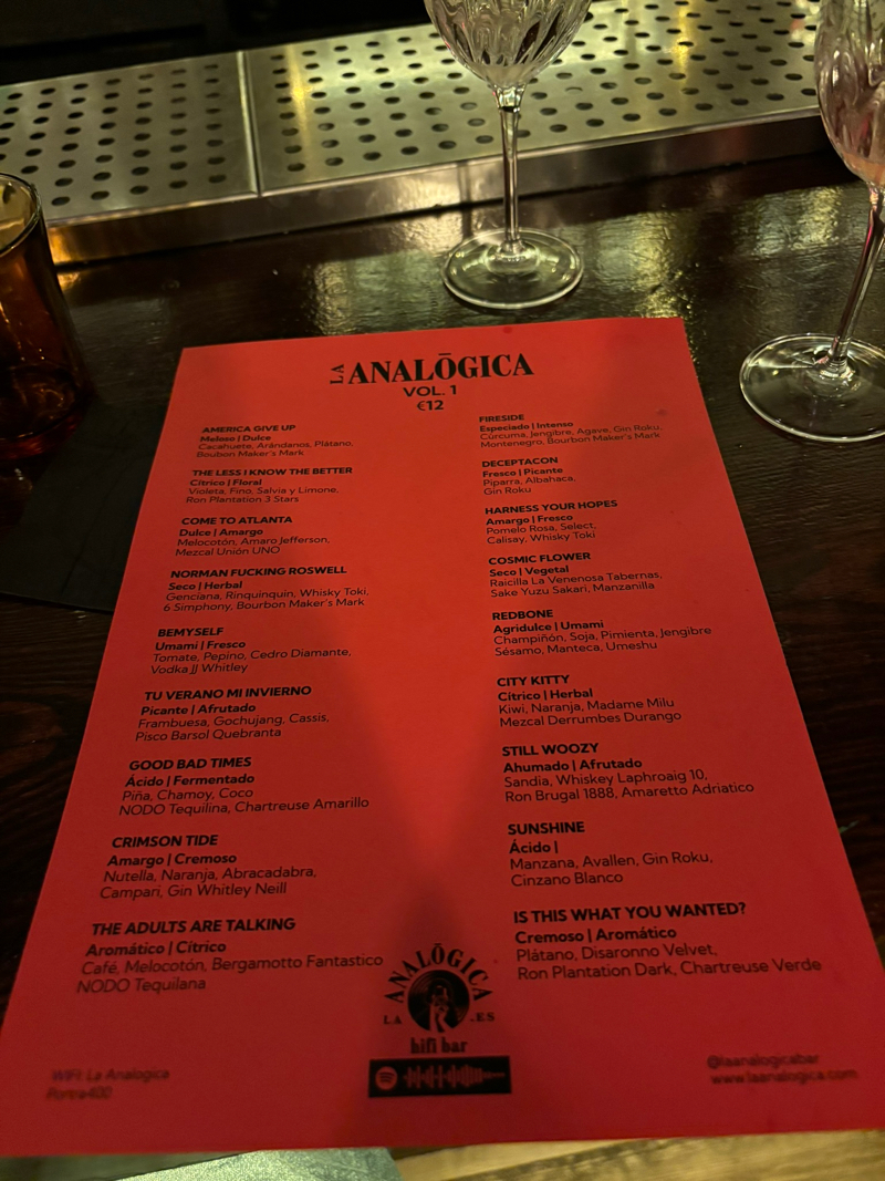 Pero no todo son los cócteles. Y es que La Analógica late al ritmo de un tocadiscos Technis SL1650 que nunca para. Nick, el cerebro tras la barra y el sonido, se asegura de que cada sorbo tenga su banda sonora. Arctic Monkeys, The Strokes, Lana del Rey o The Marias son solo algunos de los protagonistas de la playlist.