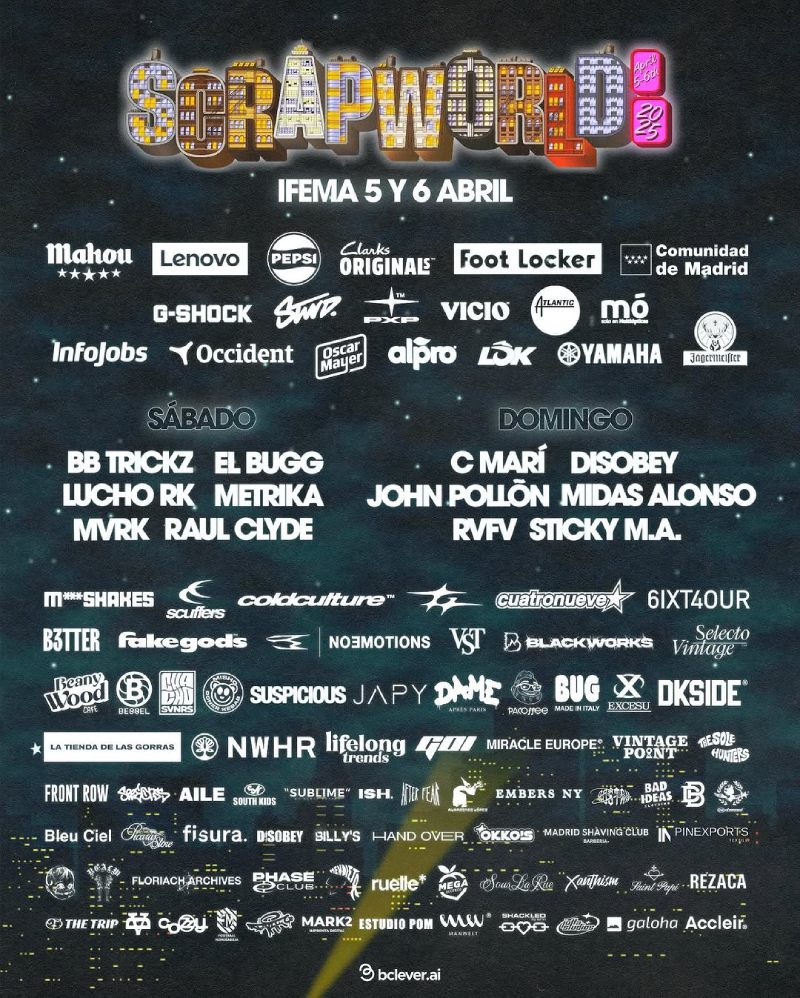Este año, como todo es -a lo grande- han conseguido un cartel del mismo calibre. ¿A quiénes veremos este año? Pues los dos días pintan muy bien. El lineup de artistas confirmados para Scrapworld 2025 nos tiene preparados muy buenos conciertos. El sábado 5 de abril veremos a BB Trickz, El Bugg, Lucho Rk, Metrika, Mvrk y Clyde. El domingo 6, tendremos a C Marí, Disobey, John Pollón, Midas Alonso, Rvfv y Sticky M.A.