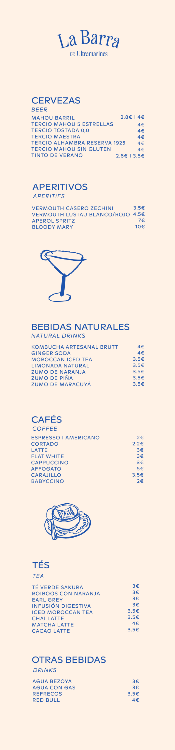 El local revisita el bar madrileño con una sensibilidad actual que esquiva tópicos y rehúye la asepsia moderna. El hormigón visto se mantiene como huella original y encuentra equilibrio en el granito, la madera y el latón, materiales cálidos y atemporales. Mobiliario y luminarias, inspirados en el diseño europeo de mediados del siglo XX, acompañan una intervención gráfica que dota de personalidad a La Barra de Ultramarines sin comprometer la sobriedad buscada.