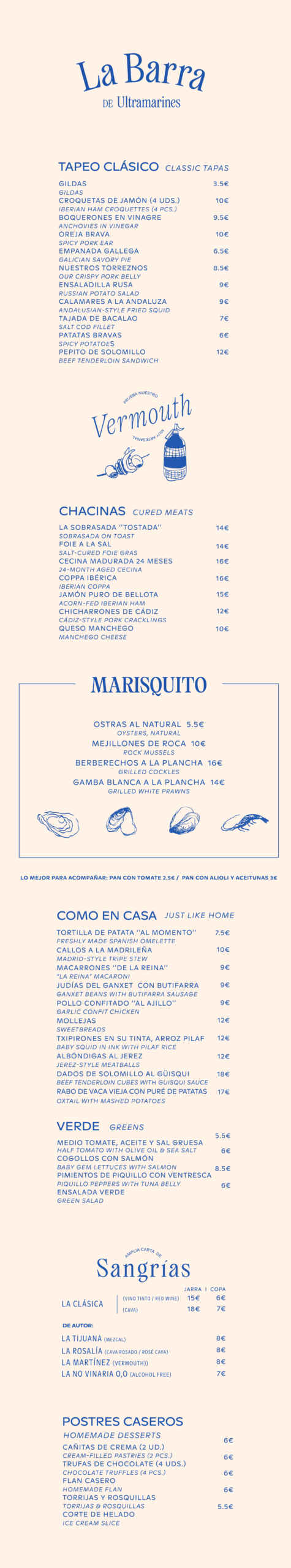 Pese a su nueva ubicación en un exclusivo alojamiento de cinco estrellas del centro de la capital, La Barra de Ultramarines no ha perdido el norte. Su propósito sigue siendo el de ensalzar el bar de toda la vida. Allí se tapea, se comparten platillos tradicionales con producto de calidad y se disfruta sin esa presión tan extendida, por desgracia, de tener que abandonar la mesa o el taburete antes de tiempo, con camareros al acecho para que tu sitio lo ocupe el siguiente comensal.