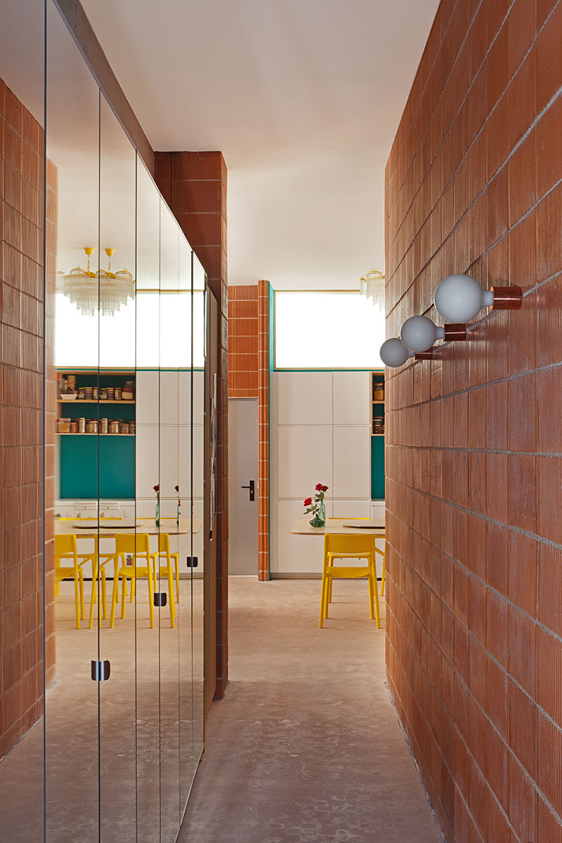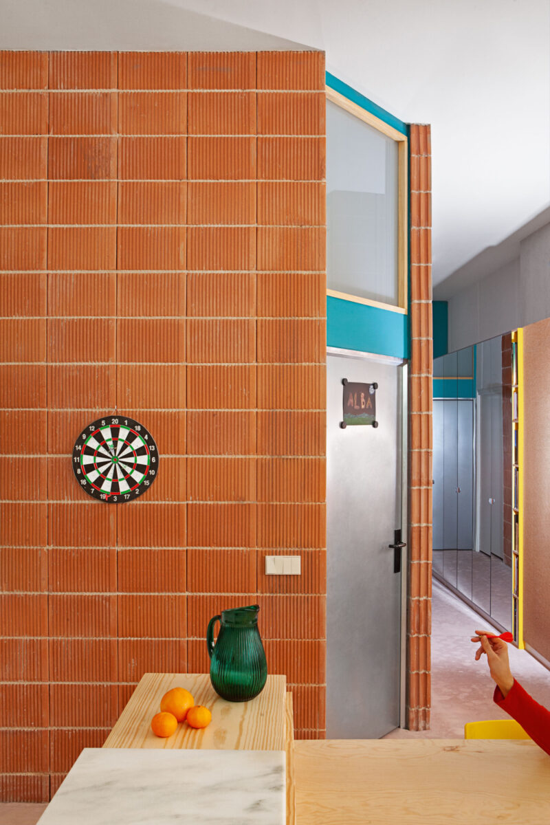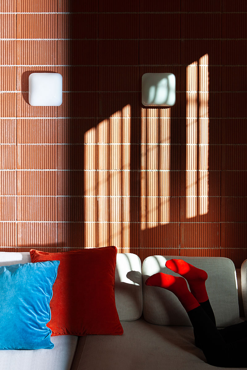 Uno de los materiales estrella en este proyecto es el ladrillo megatosco. El formato de las piezas permite tener menos juntas respecto al ladrillo tradicional y, además se ha colocado a junta continua para potenciar la verticalidad de sus llagas. Para no cargar visualmente el conjunto, se revistieron algunas paredes con mortero de cal, elaborado con arena fina para conseguir una textura más suave.