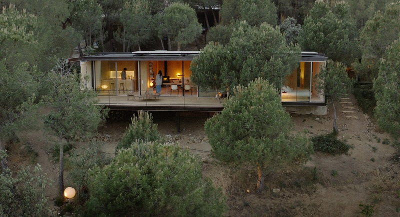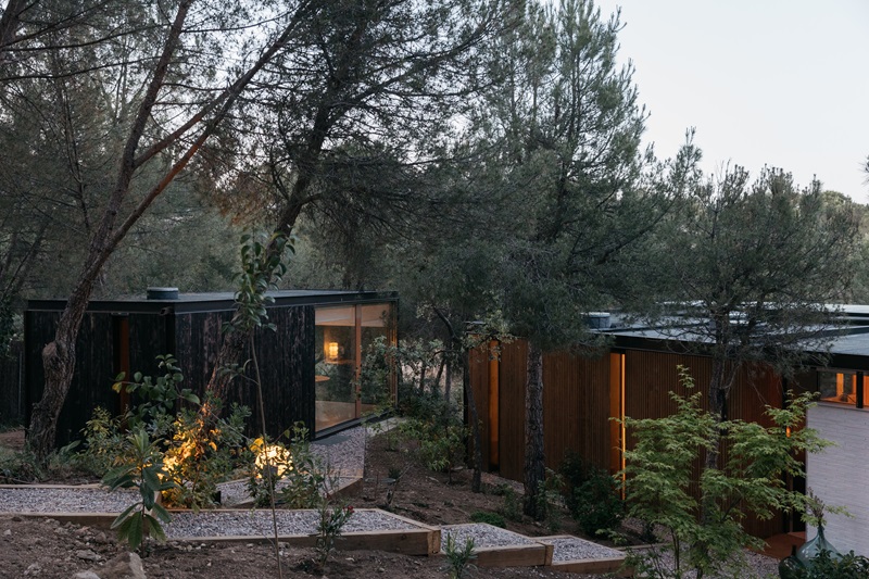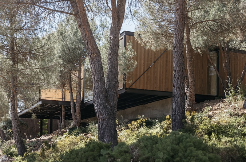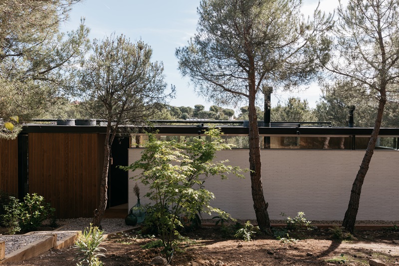 Arquitectura industrializada modular y obra tradicional conviven en Fresnos, un hogar y espacio de trabajo resguardado entre los frondosos pinos del paisaje natural de la Sierra de Madrid. El proyecto es obra del estudio madrileño Delavegacanolasso, fundado en 2017 por los arquitectos Pilar Cano-Lasso e Ignacio de la Vega.
