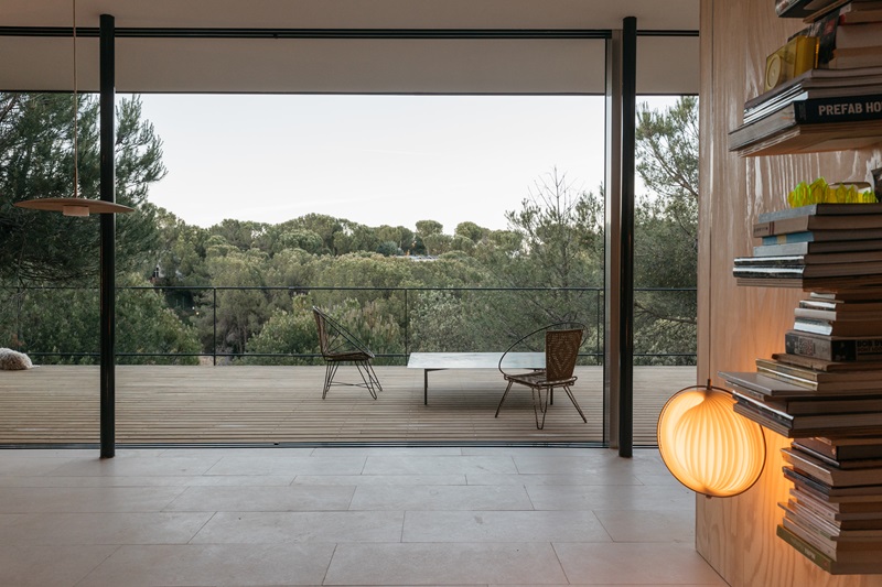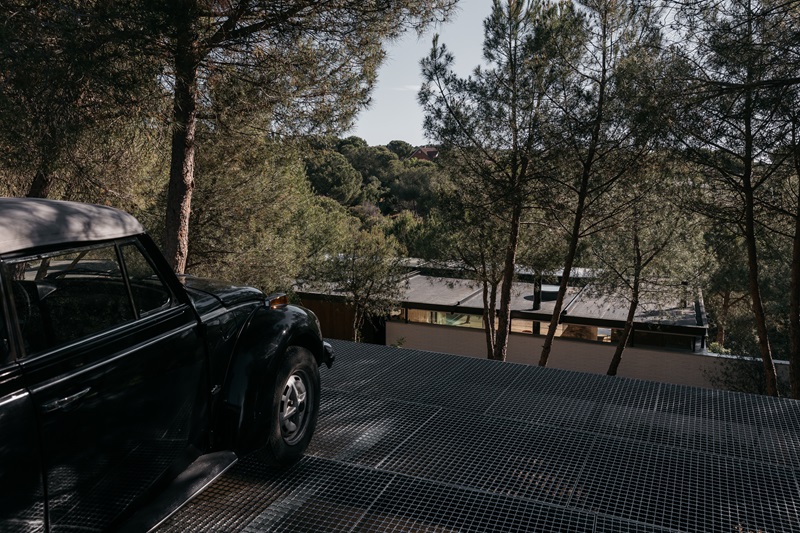Desde la puerta de entrada a la parcela de Fresnos, se contempla una interminable panorámica del boscoso paisaje de la Sierra de Madrid. La casa-estudio construida por Delavegacanolasso se asienta en un nivel inferior, al cobijo de la pendiente del terreno y la sombra de los pinos. Los arquitectos iniciaron el diseño desde el convencimiento de preservar la belleza del entorno. “Teníamos el reto autoimpuesto de mantener todos los árboles. No tocamos ninguno de los 45 pinos, así que contábamos con un jardín precioso desde el principio. Creemos que el arbolado natural ha de ser respetado al máximo. Poco sentido tiene el planteamiento, que se repite mucho hoy en día, de arrasar la parcela para construir la casa y, al terminarla, invertir una gran cantidad de dinero en crear un jardín”, subraya Cano-Lasso. Además, añadieron nuevos árboles como arces, ejemplares de liquidámbar y varias especies de frutales.