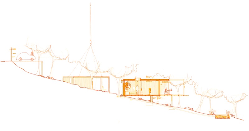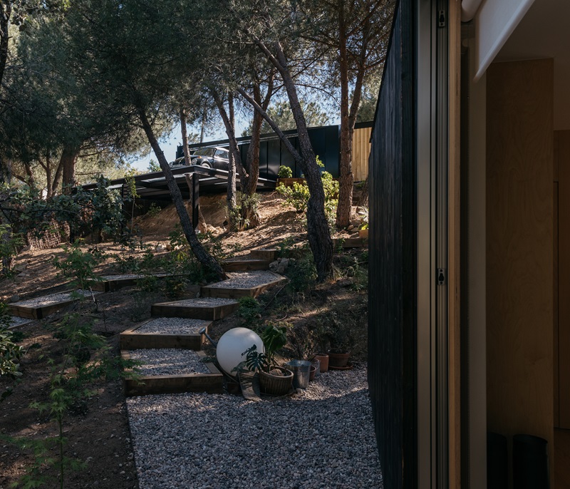 El proyecto de 142 m2 se divide en dos volúmenes independientes, uno para vivir y otro para trabajar, a los que se accede descendiendo por un sendero pavimentado con traviesas de pino y grava, dejando atrás la plataforma metálica reservada para aparcar los coches al nivel de la calle.