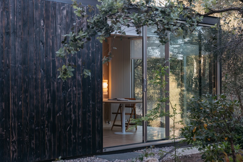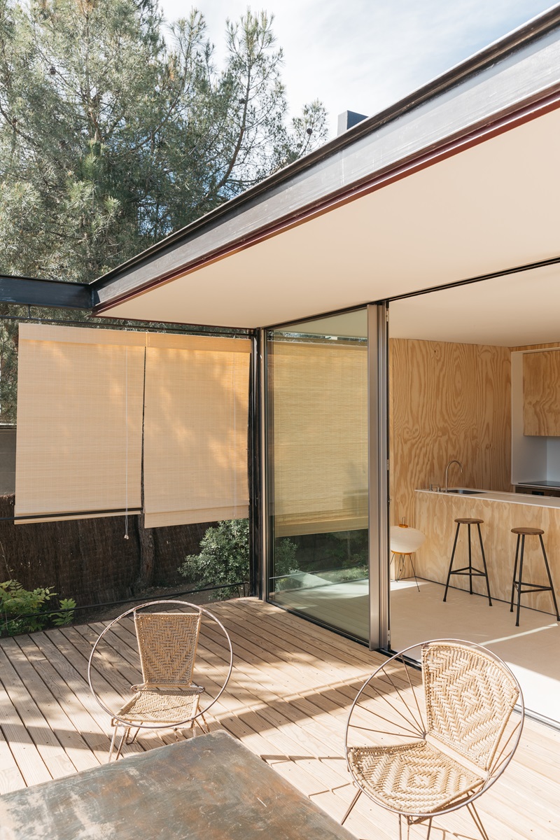 El espacio de trabajo se ubica en otro módulo de 7,80 m x 3 m, completamente independiente, dispuesto en un ángulo aproximado de 45 grados respecto a la vivienda. “Nos gusta este gesto porque evoca las calles de los pueblos, donde en cierto momento los volúmenes se acercan estrechándolas para, a continuación, dar paso a la luz que las abre al llegar a la plaza”, afirman los arquitectos.