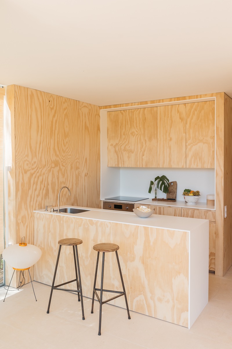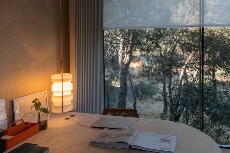 En el interior, los arquitectos se decantan por materiales de colores cálidos en tonos claros, consiguiendo una atmósfera luminosa y acogedora. Para el estudio, utilizan la madera de abedul, mientras que, en la vivienda, optan por el contrachapado de pino. Ambos en armonía con los suelos de piedra caliza. La decoración también se caracteriza por su paleta neutra, con puntuales piezas de mobiliario en color. Y para conseguir un buen rendimiento energético han escogido: “un sistema de climatización de suelo radiante refrescante con aerotermia, y lo hemos combinado con placas solares en la cubierta”, explica Cano-Lasso.