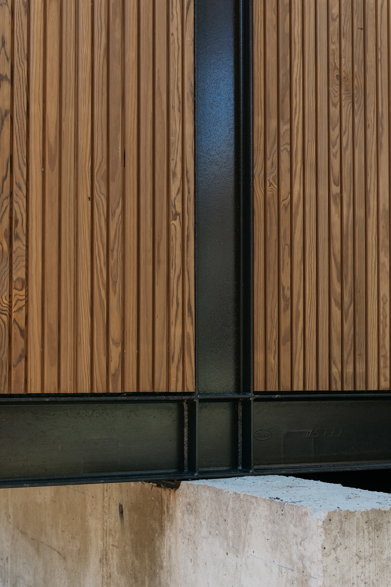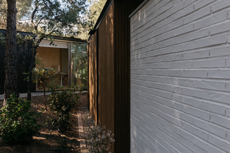 El volumen destinado al hogar es fruto tanto del trabajo en obra, como en taller. Un sistema mixto, perceptible desde el exterior. Y es que el blanco del muro de ladrillo, que delimita la zona de día, contrasta con el tono oscuro de la madera de los módulos tini®, que albergan la zona de noche. El diseño de la fachada está marcado por la gran ventana longitudinal que corona el muro, con una estética que bebe de las influencias del movimiento moderno, al igual que la cubierta plana.
