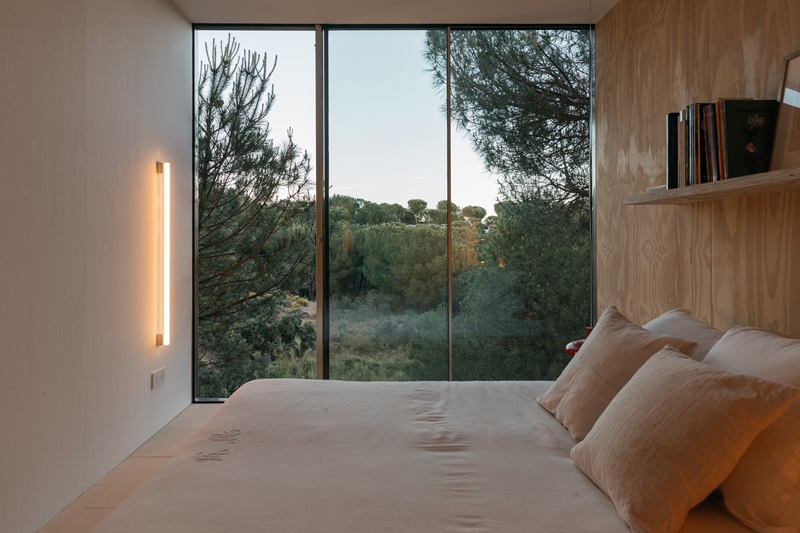 La vivienda cuenta con dos dormitorios y dos baños incluidos en dos módulos de 7,80 m de largo x 3 m de ancho. Y un espacio diáfano, que engloba la cocina, el comedor y el salón, comprendido por: “tres crujías más, que siguen dicha modulación, pero que se ejecutaron in situ con muros de ladrillo manual encalados. Pensamos que la manera de tocar el terreno lo mínimo posible era a través de un sistema industrializado. Pero, a la vez, queríamos incorporar la gracia y los matices de la obra tradicional. El contraste de lo actual y lo atemporal da una arquitectura rica, que mejora con el paso del tiempo”, explican los arquitectos.