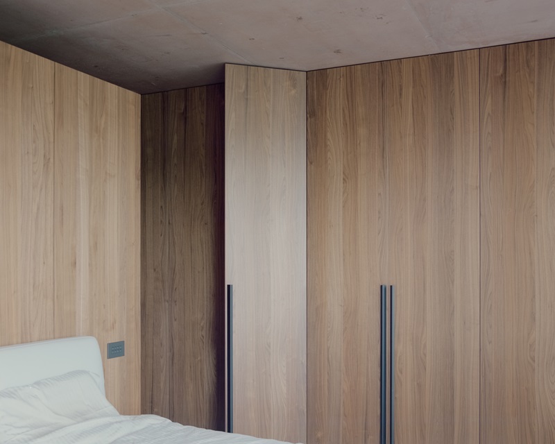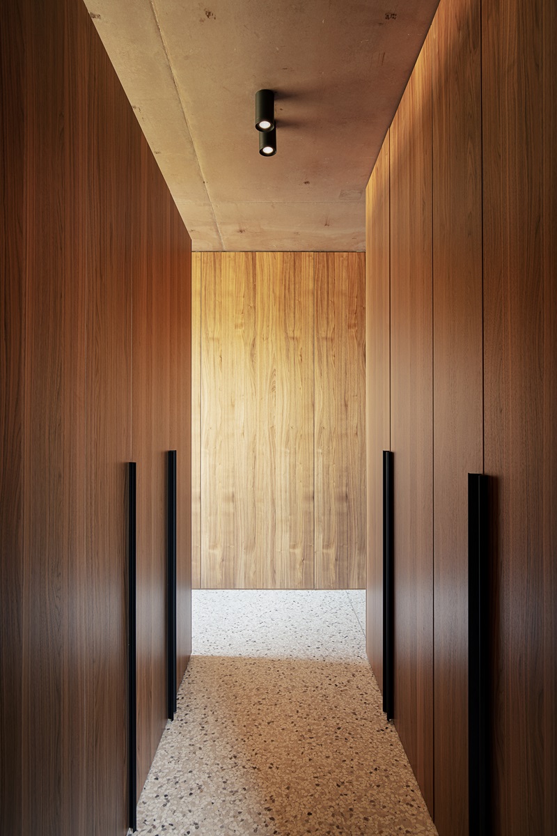 Los arquitectos han organizado la distribución de la casa orientando la zona de día, al sur, y la de descanso, al norte. Para aislar y optimizar el aprovechamiento del espacio en todas las estancias, el equipo ha compartimentado la vivienda con tabiques construidos como sistema de almacenaje. Planos verticales de armarios de madera, que infunden calidez a los interiores y son artífices de una decoración marcada por el orden.