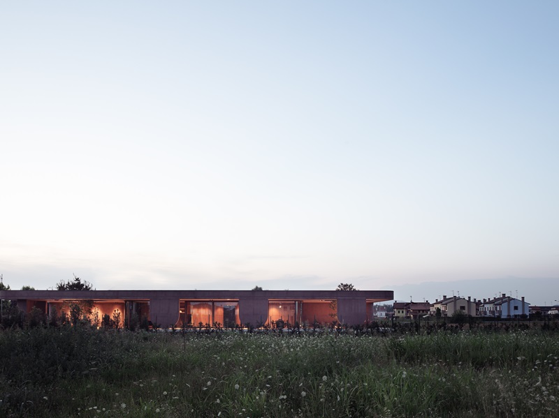 Igual que una gema relucen las fachadas de hormigón en tono rosáceo de esta casa con un gran pórtico, construida en el pequeño municipio de Sant’Elena, con la que el estudio italiano Mide Architetti hizo realidad el sueño de sus clientes de vivir plenamente sumergidos en la naturaleza.