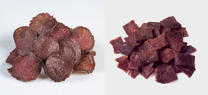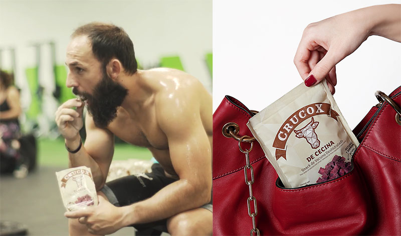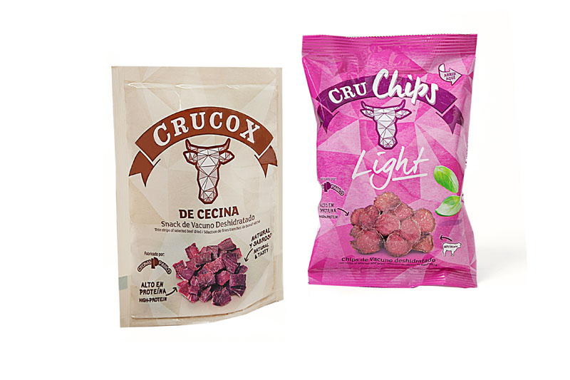 Esta empresa que no podía estar ubicada en otra zona de España: Astorga (León), ha sacado al mercado dos productos muy interesantes. Por un lado Cru Chips Light, que son unas finas láminas crujientes de vacuno deshidratado en bolsas de 40 gramos. Por otro lado un producto que se llama Crucox que es un snack cárnico de cecina deshidratada muy sabroso y que se puede conseguir en bolsas de 25 gramos. Los dos tienen un alto contenido en proteínas con un efecto saciante muy potente.
