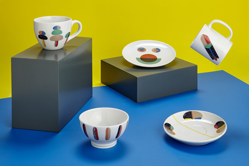 Nueve estudio ha creado dos líneas: un juego de té para adultos y un set de desayuno para niños con motivos gráficos que combinan colores planos y fotos de texturas de materiales, como respuesta al perfil del consumidor marcado por Surgenia en su informe sobre el observatorio de tendencias del hábitat.